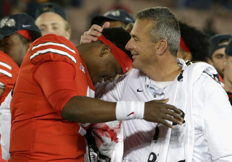 PASADENA, CA – JANUARY 01: Dwayne Haskins #7 of the Ohio State Buckeyes and Ohio State Buckeyes head coach Urban Meyer celebrate after winning the Rose Bowl Game presented by Northwestern Mutual at the Rose Bowl on January 1, 2019 in Pasadena, California. (Photo by Jeff Gross/Getty Images)