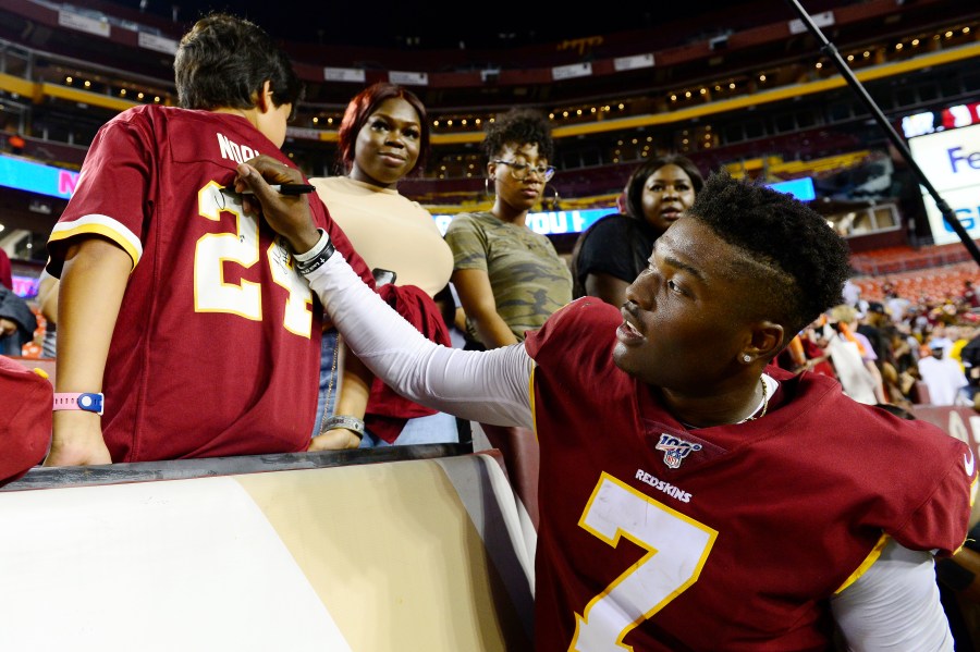 LANDOVER, MD – AUGUST 15: Dwayne Haskins #7 of the Washington Redskins signs an autograph for a fan after the Cincinnati Bengals defeated the Redskins 23-13 during a preseason game at FedExField on August 15, 2019 in Landover, Maryland. (Photo by Patrick McDermott/Getty Images)
