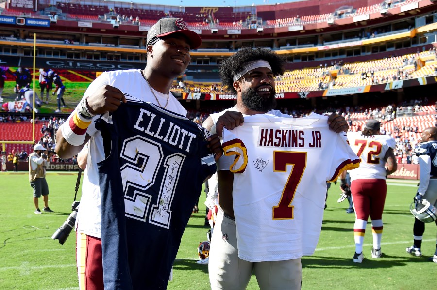 LANDOVER, MD – SEPTEMBER 15: Dwayne Haskins #7 of the Washington Redskins and Ezekiel Elliott #21 of the Dallas Cowboys pose for a picture after swapping jerseys at the end of the game at FedExField on September 15, 2019 in Landover, Maryland. (Photo by Will Newton/Getty Images)
