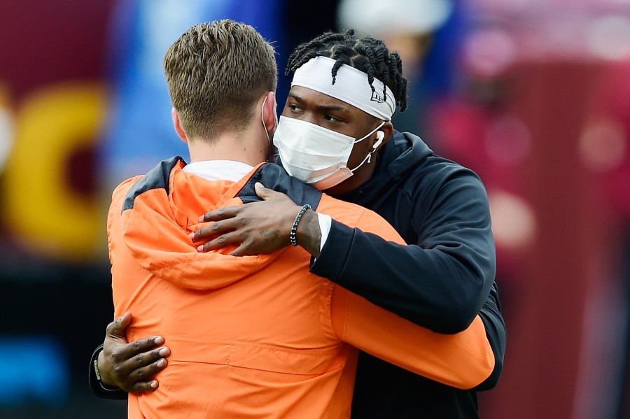 LANDOVER, MARYLAND – NOVEMBER 22: Joe Burrow #9 of the Cincinnati Bengals (L) gets a hug from Dwayne Haskins #7 of the Washington Football Team (R) prior to their game at FedExField on November 22, 2020 in Landover, Maryland. (Photo by Patrick McDermott/Getty Images)