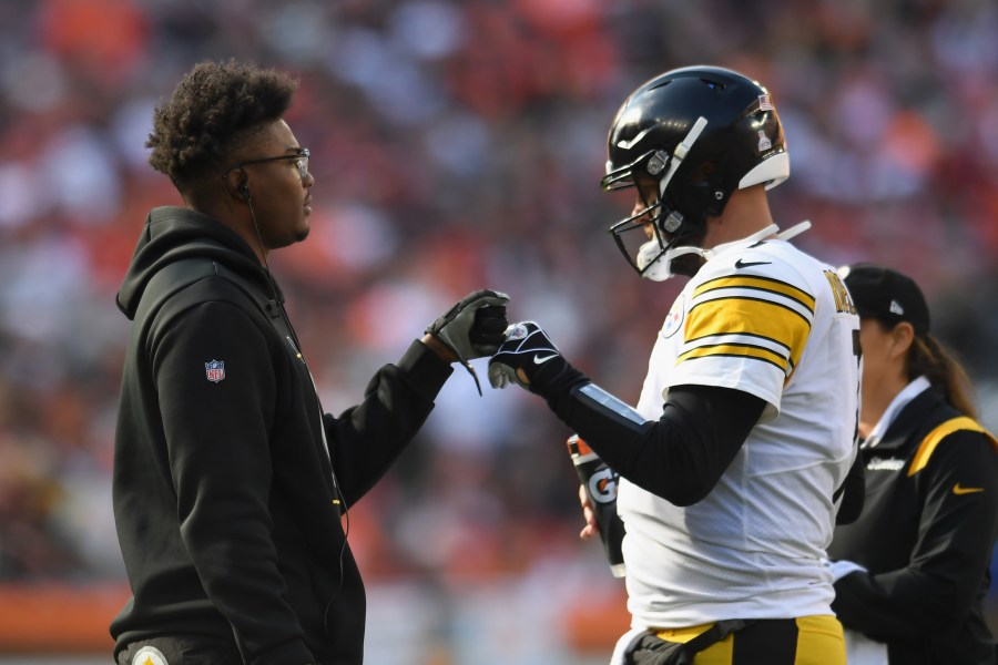 CLEVELAND, OHIO – OCTOBER 31: Dwayne Haskins #3 fist bumps Ben Roethlisberger #7 of the Pittsburgh Steelers during the first half against the Cleveland Browns at FirstEnergy Stadium on October 31, 2021 in Cleveland, Ohio. (Photo by Nick Cammett/Getty Images)