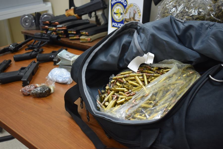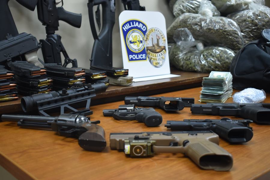 HILLIARD, Ohio (WCMH) — Guns including AR-15 and AK-47 rifles and thousands of rounds of ammunition were seized by police on Thursday during a drug swoop which also netted opioids and cash.