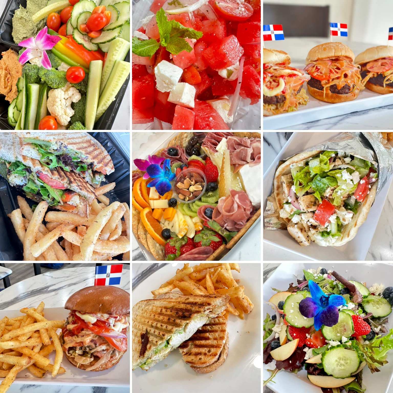 The café food menu also offers brunch options including buttermilk pancakes, cinnamon rolls, avocado toast, and more. For lunch and dinner, the shop has fresh salads, burgers, paninis and entrees from herb lemon chicken to salmon and mussels.