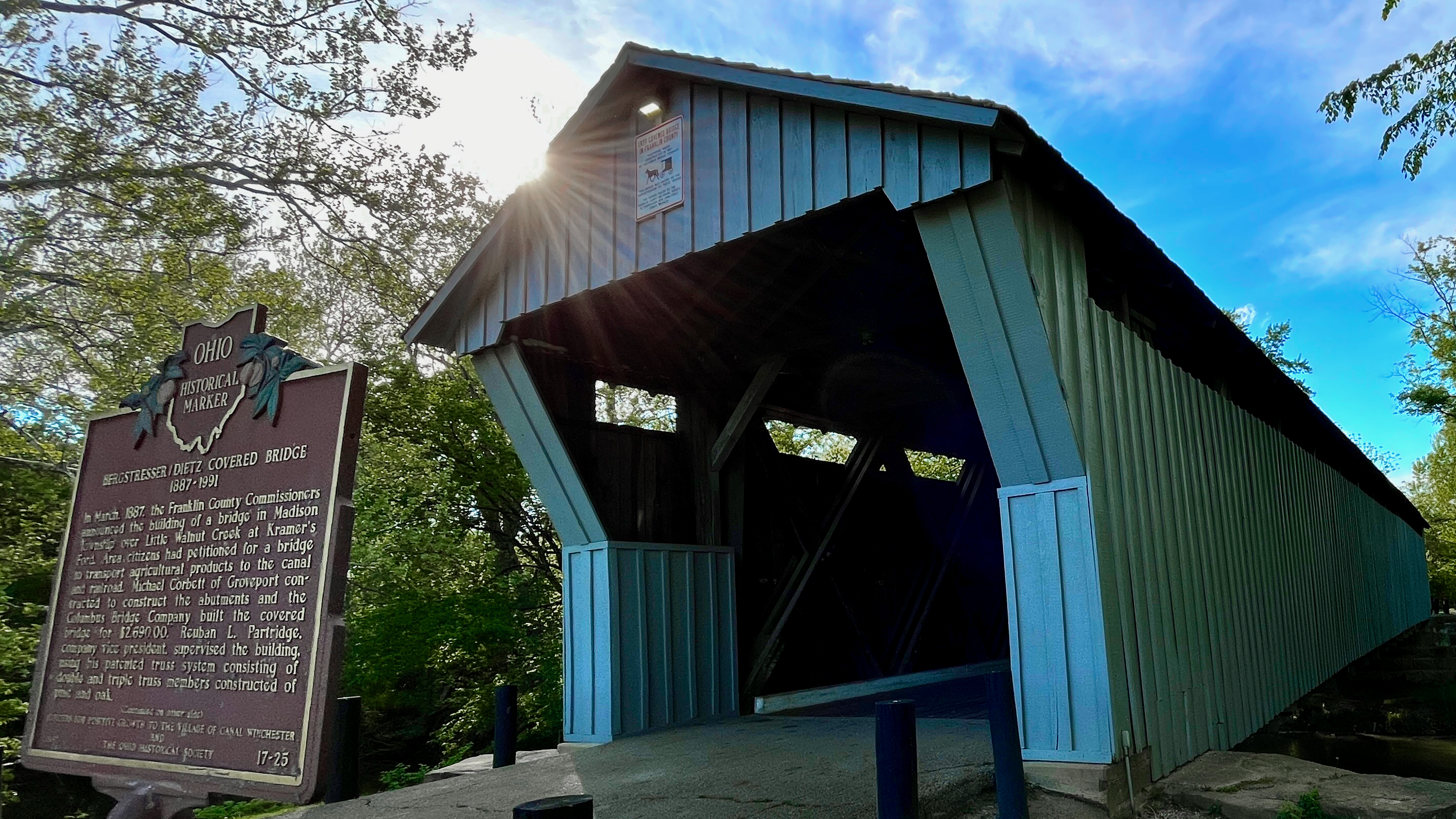 CANAL WINCHESTER, Ohio (WCMH)–In March. 1887. the Franklin County Commissioners announced the building of a bridge ini Madison Township over Little Walnut Creek at Karmer’s Ford. Area citizens had petitioned for a bridge to transport agricultural products to the canal and railroad. Michael Corbett of Groveport contracted to construct the abutments and the Columbus Bridge Company built the covered bridge for $,2,690. Reuban L. Partridge company Vice President supervised the building using his patented truss system consisting of double and triple truss members constructed of pine and oak.