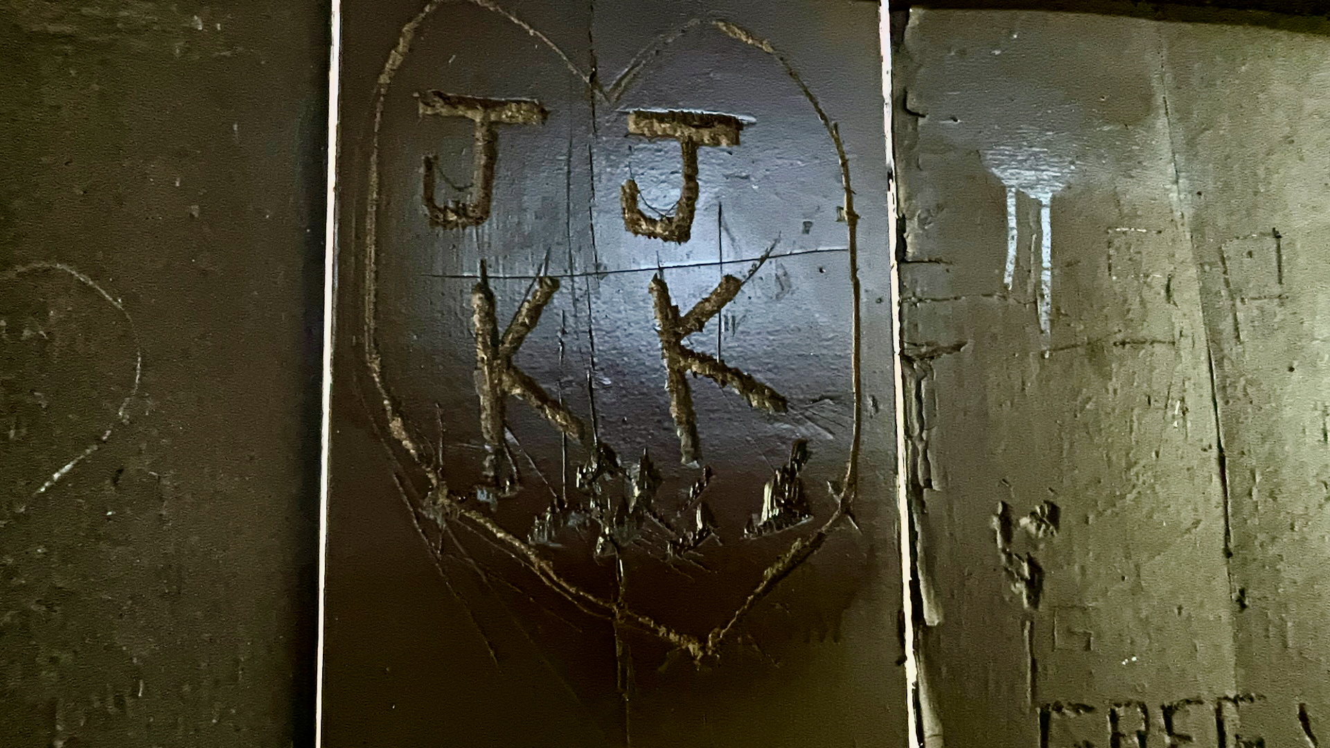 CARROLL, Ohio (WCMH)–Initials carved into the wall of the Hartman #2 Bridge. Whoever J.J. and K.K. are or were, the wonder is if their love lasted. (photo by Tony Mirones)