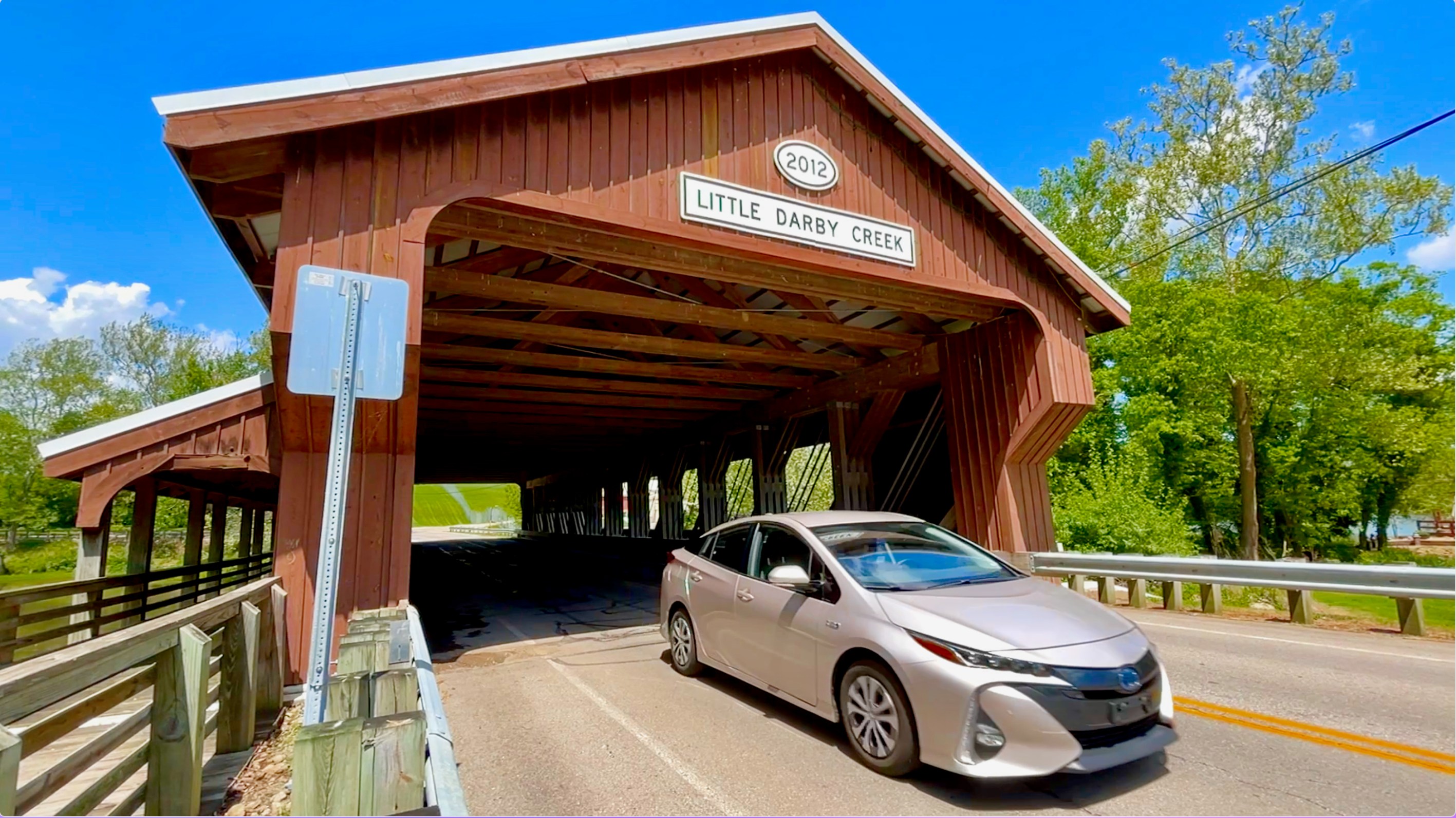 WEST JEFFERSON, Ohio (WCMH)–A car exits the Taylor Blair Rd covered bridge. (photo by Tony Mirones)