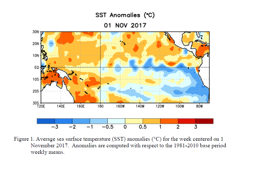 Notice in this image that there is colder than normal waters along the equator (represented by the blue). The waters in this area are also getting increasingly cooler below the surface too, which may indicate an increasing chance of La Niña forming for this Winter.