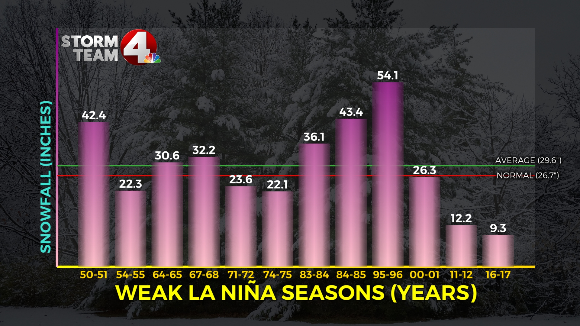During the 21 seasons on record of La Niña Winters, 12 of them have been considered “weak”