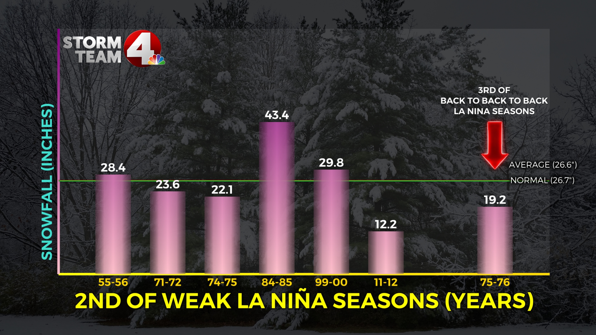 Notice the average of the 2nd season of back to back La La Niña Winter is almost identical to our normal snowfall for the season at 26.6″ vs 26.7″