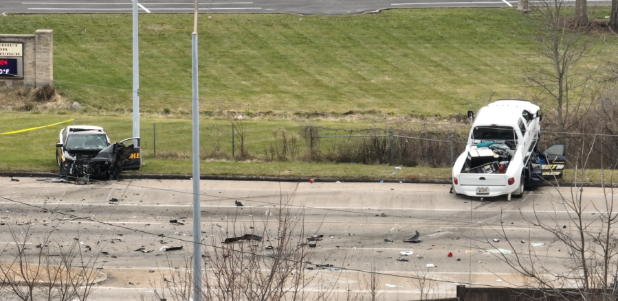 At least one police cruiser and a deputy’s car were damaged as the chase came to a close. A large police presence formed on U.S. 35 near the Liscum Drive intersection, around five miles west of Dayton’s downtown. As of 3 p.m., the roadway was closed in both directions between Abbey Road and Infirmary Road with three different active crime scenes, according to Trotwood Police Chief Erik Wilson. The roadway reopened by 8:30 p.m.