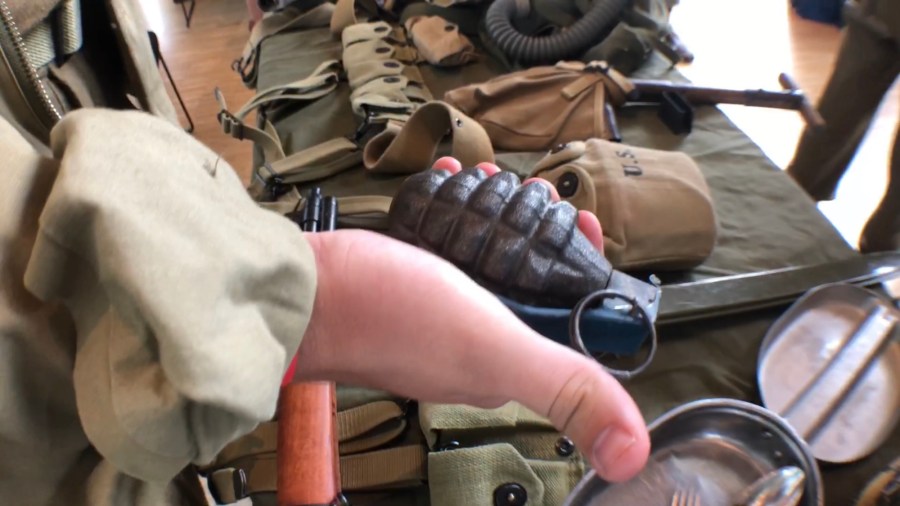 The family dresses up in World War II military uniforms, fatigues, and blues while providing a show and tell of weapons and other equipment the armed forces used. From grenades to typewriters, the visitors got to experience what it was like to use the tools.