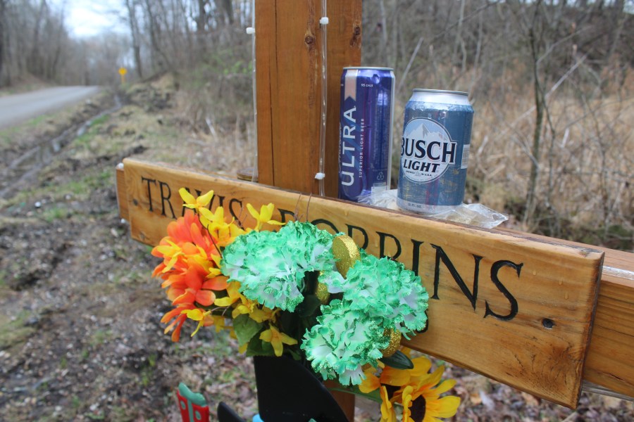 A wooden cross engraved with Travis Robbins’ name stands on the side of Dresden Road near Zanesville. The 32-year-old’s sparse remains were found deep into the woods.