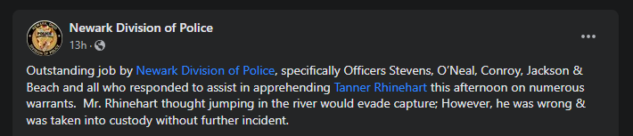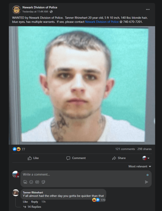 The Newark Division of Police’s latest post, after Tanner Rhinehart was arrested. (Courtesy Graphic/Newark Division of Police)