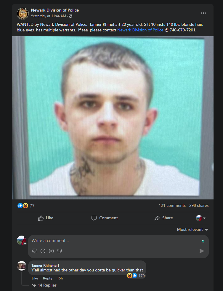 When Newark police previously put out a Facebook post asking for help finding Rhinehart, the 20-year-old took the opportunity to tease them. He referenced an apparent close call he had earlier as they looked for him.