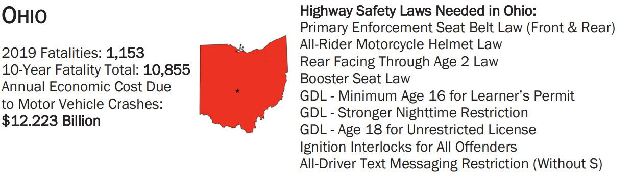 Ohio was listed as having only six of the advocates optimal laws while missing multiple recommended laws including no front and rear enforcement seat belt law, no motorcycle helmet law, no booster seat laws, and more.