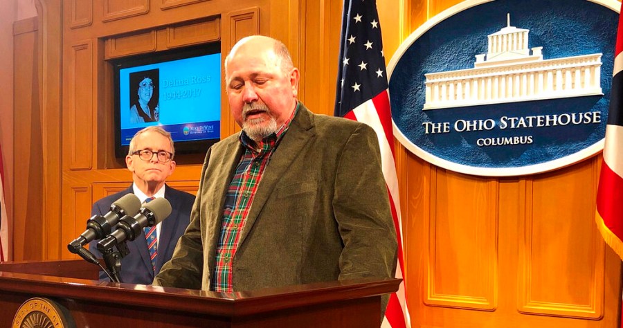Terry Dawson, right, the son-in-law of a woman killed by a distracted driver in central Ohio on Christmas Eve 2017, describes how that accident has affected his family and made holidays much harder, at a news conference also attended by Ohio Gov. Mike DeWine, on Friday, Dec. 20, 2019, in Columbus, Ohio. DeWine said he wants distracted driving made a primary offense and promised a legislative proposal soon. (AP Photo/Andrew Welsh-Huggins)