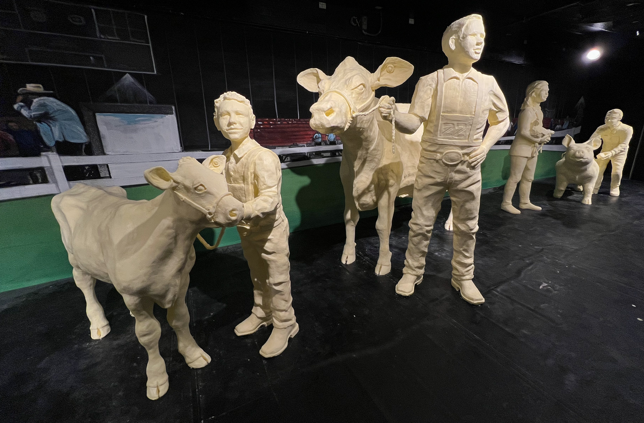For the first time ever, the traditional butter cow and calf are joined by other farm animals inside the butter cooler. This year’s butter display celebrates the agricultural roots of the fair, depicting young exhibitors showing their animals. (Courtesy Photo/American Dairy Association Mideast)