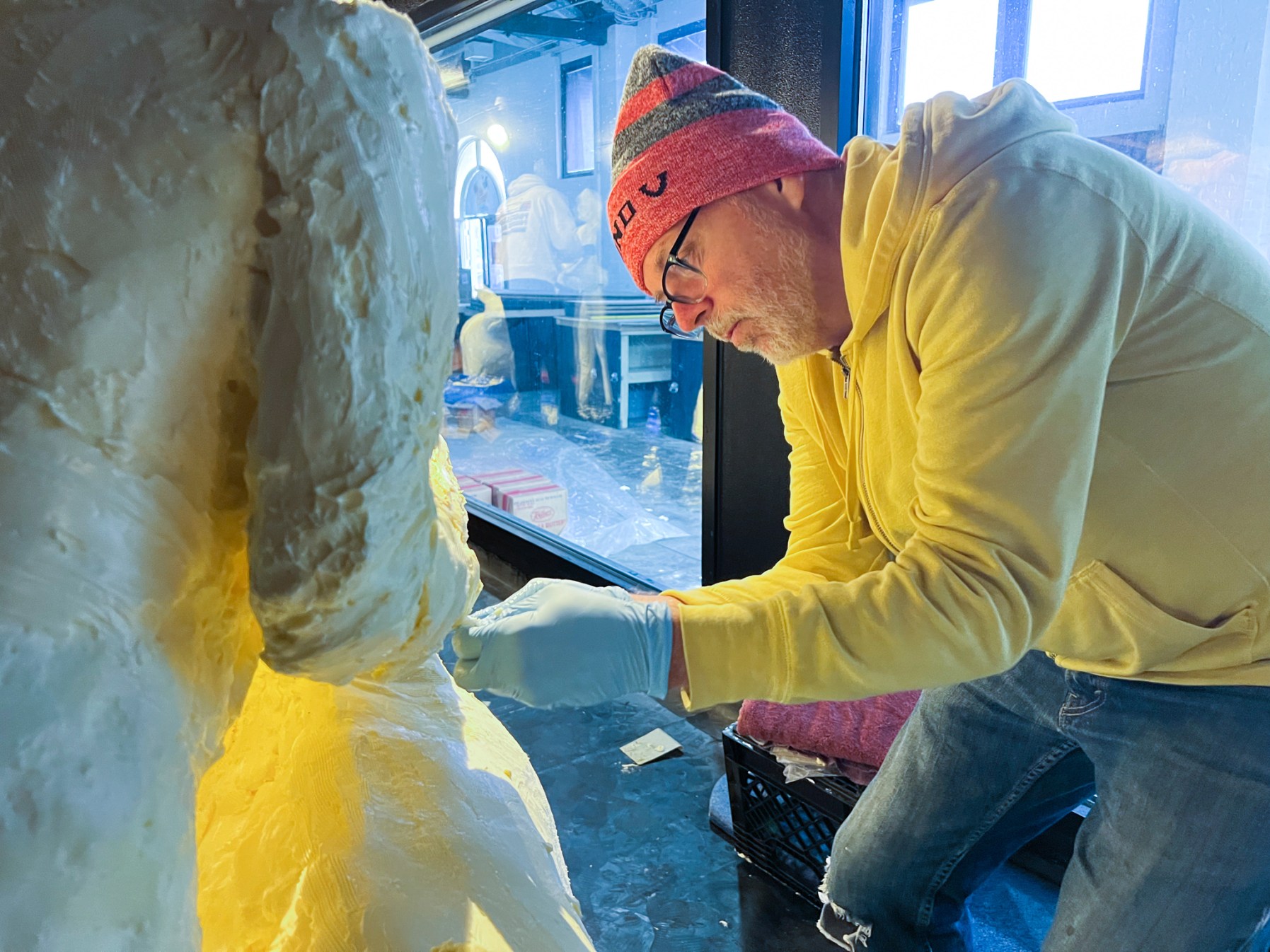 Technical sculptor Paul Brooke works inside a 46-degree cooler to chisel the details of this year’s butter display. Fairgoers returning to the fair this year can enjoy the biggest butter display ever, which took over 2,500 pounds of butter to create. (Courtesy Photo/American Dairy Association Mideast)