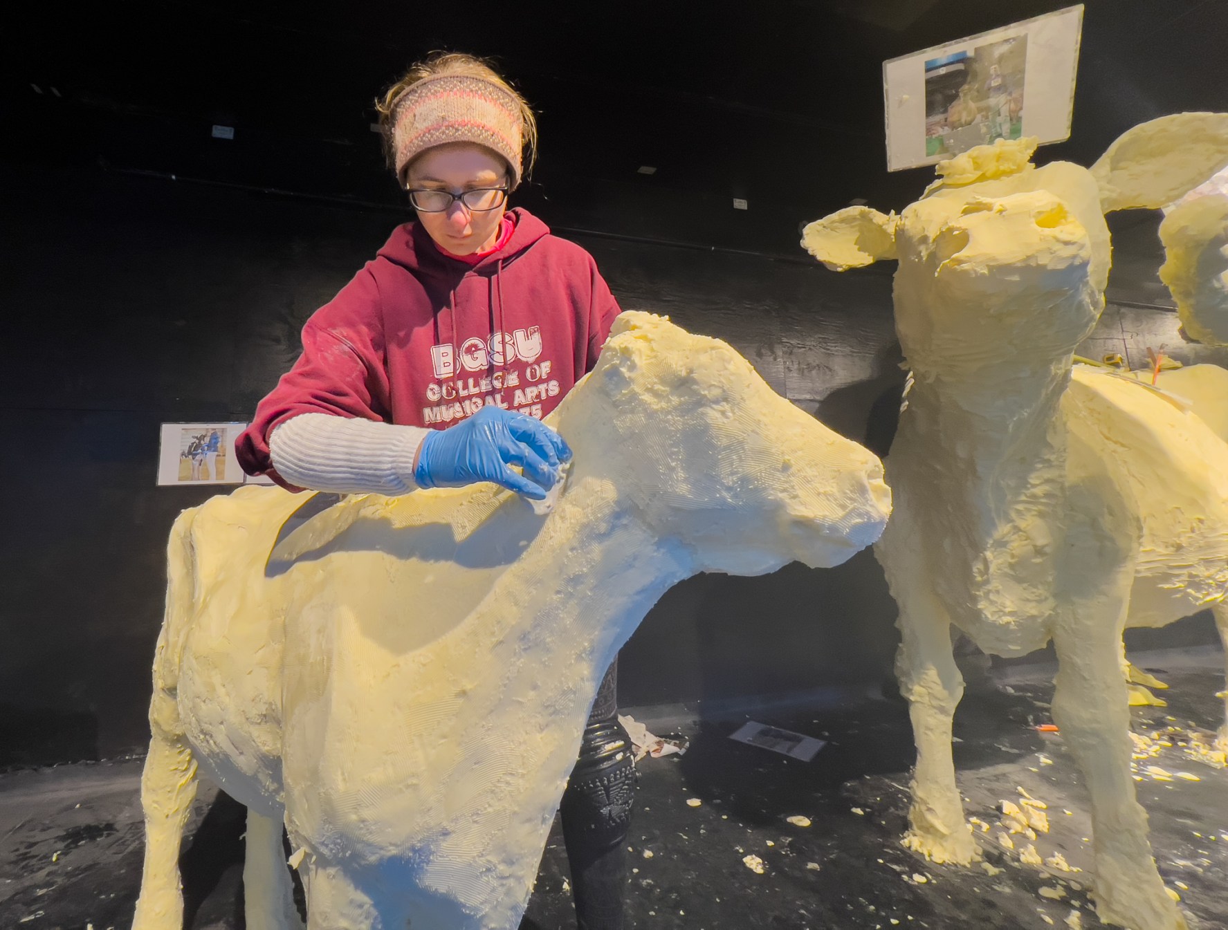 Tammy Buerk sculpts the traditional butter calf inside a cooler at the Ohio State Fair. For the first time in three years, the butter display is back and bigger than ever. Fairgoers can gaze upon more than 2,500 pounds of butter, artfully crafted into life-size sculptures. (Courtesy Photo/American Dairy Association Mideast)
