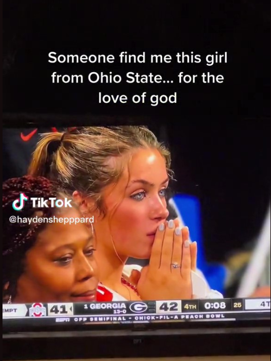 TikTok creator Hayden Sheppard posted a short clip of the Peach Bowl broadcast highlighting 19-year-old Catherine Gurd from New Albany. In the video, Gurd, dressed in Buckeye garb, holds her hands up to her mouth in a prayer position in the final moments of the game between Ohio State and Georgia. The caption on Sheppard’s post reads, “Somebody find me this girl from Ohio State… for the love of god.”