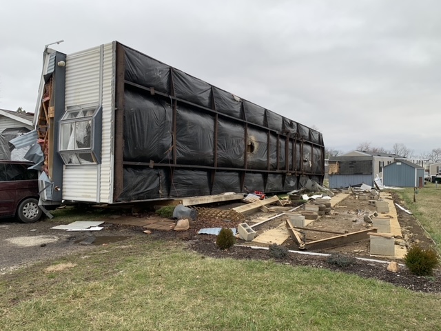 The damage from the storms was severe, with winds causing a mobile home to flip onto its side while another was turned onto its roof, damaging a neighboring residence at the Foxlair Farms park. Also, a roof was torn off a garage and several tin roofs were seen scattered about the area where the storms hit hardest.