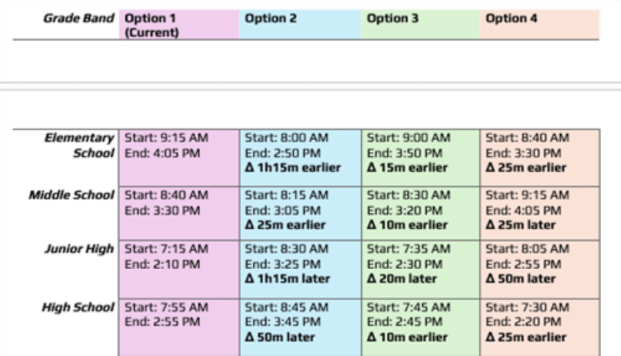 The first option keeps the current schedule and would cost the district $1.3 million more in annual operating expenses. It would take a year of planning and would add between eight and 10 new bus routes to improve efficiency. According to the district, the plan is the cheapest and would change the least, but it does not address some teachers’ concerns about changing the times.