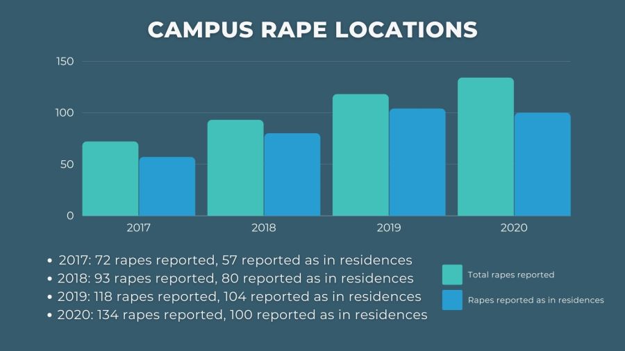 Each report gives a location of the rape, even if that location is unknown. The Clery Act gives physical boundaries — called Clery Geography — to categorize where these reported rapes happen.