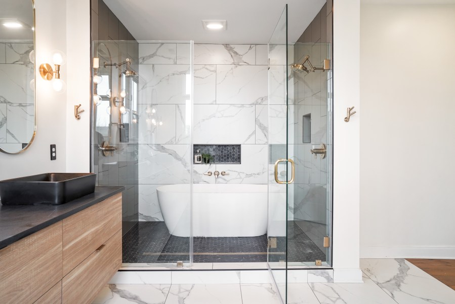 The kitchen includes black cabinetry with marble countertops, a built-in coffee machine and a pantry. Up the staircase, a bonus room and three bedrooms span the second floor, continuing the modern aesthetic with gray accent walls and white marble tiling.