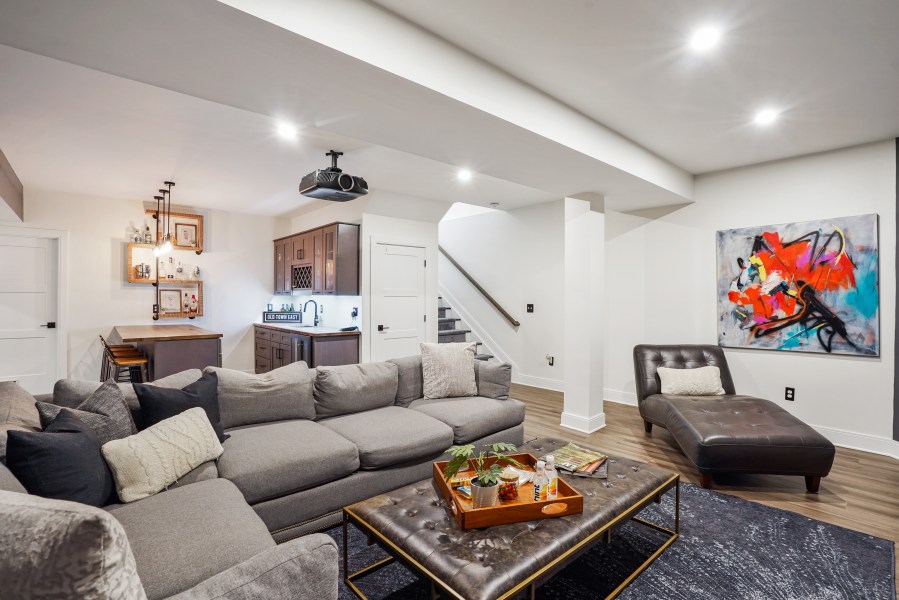 The owner’s suite features a private balcony and a spacious bathroom with a dual shower and a soaking tub. Down to the basement, a theater and recreation room features a wet bar connecting to a home fitness room. A fourth bedroom with a bathroom rounds out the lower level.