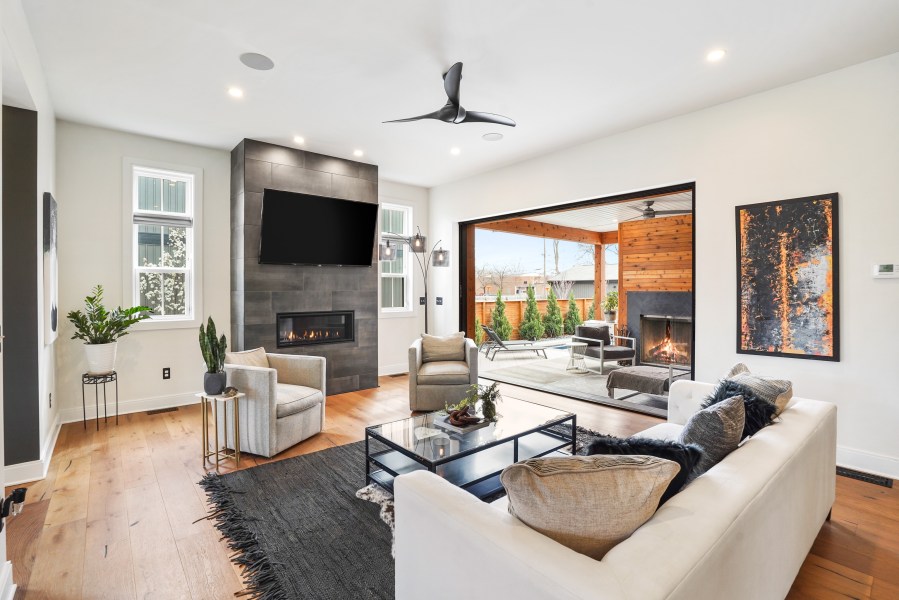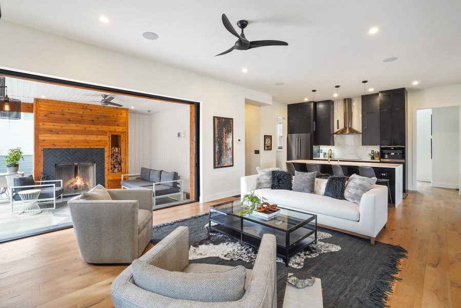 The first floor seamlessly flows from space to space with an open floor plan including the living room, dining room and kitchen. Wood flooring sprawls the first level with white walls and black and gray accents, leading to a covered patio with a wood-burning fireplace and an inground pool.