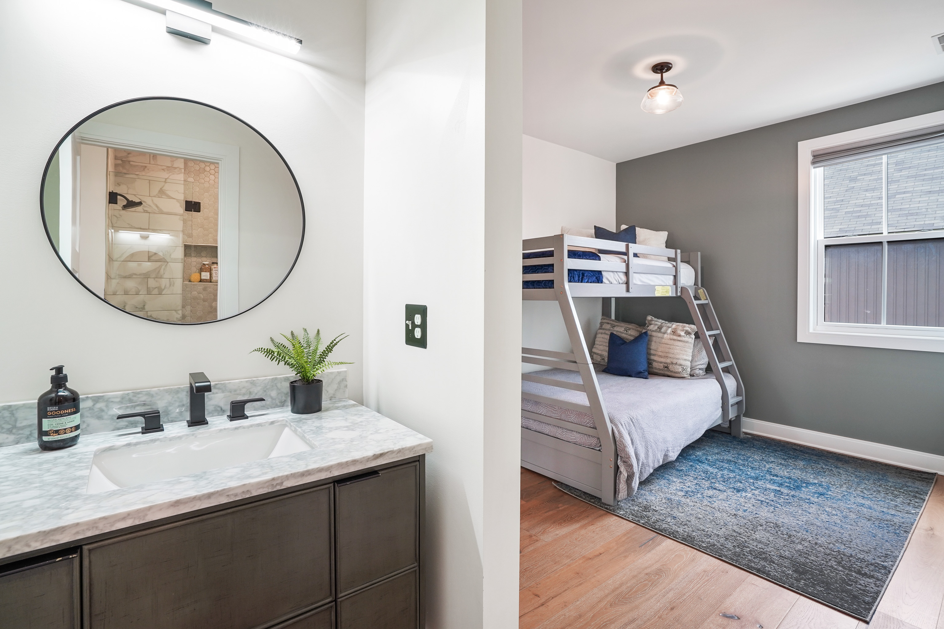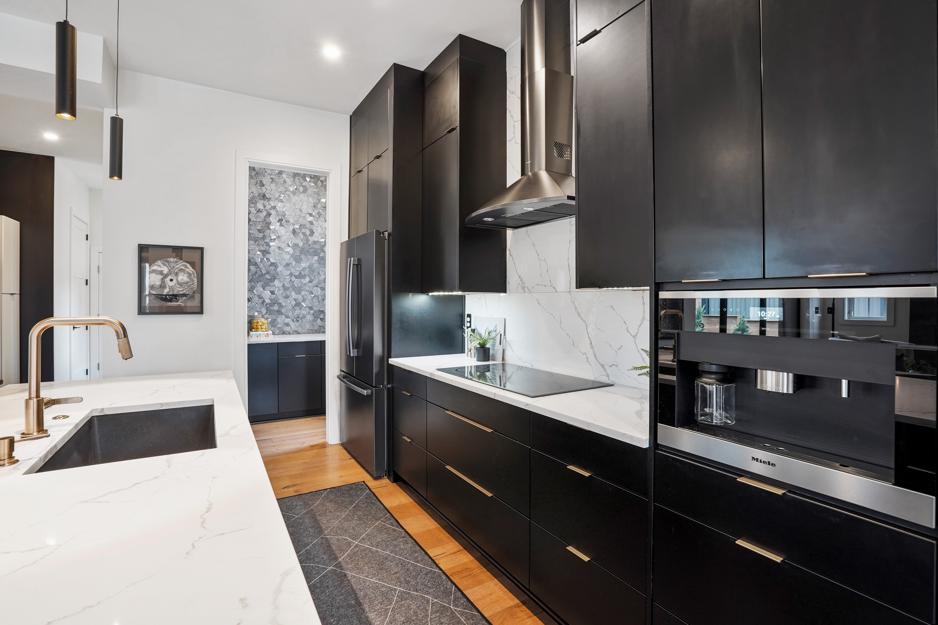 The kitchen includes black cabinetry with marble countertops, a built-in coffee machine and a pantry. Up the staircase, a bonus room and three bedrooms span the second floor, continuing the modern aesthetic with gray accent walls and white marble tiling.