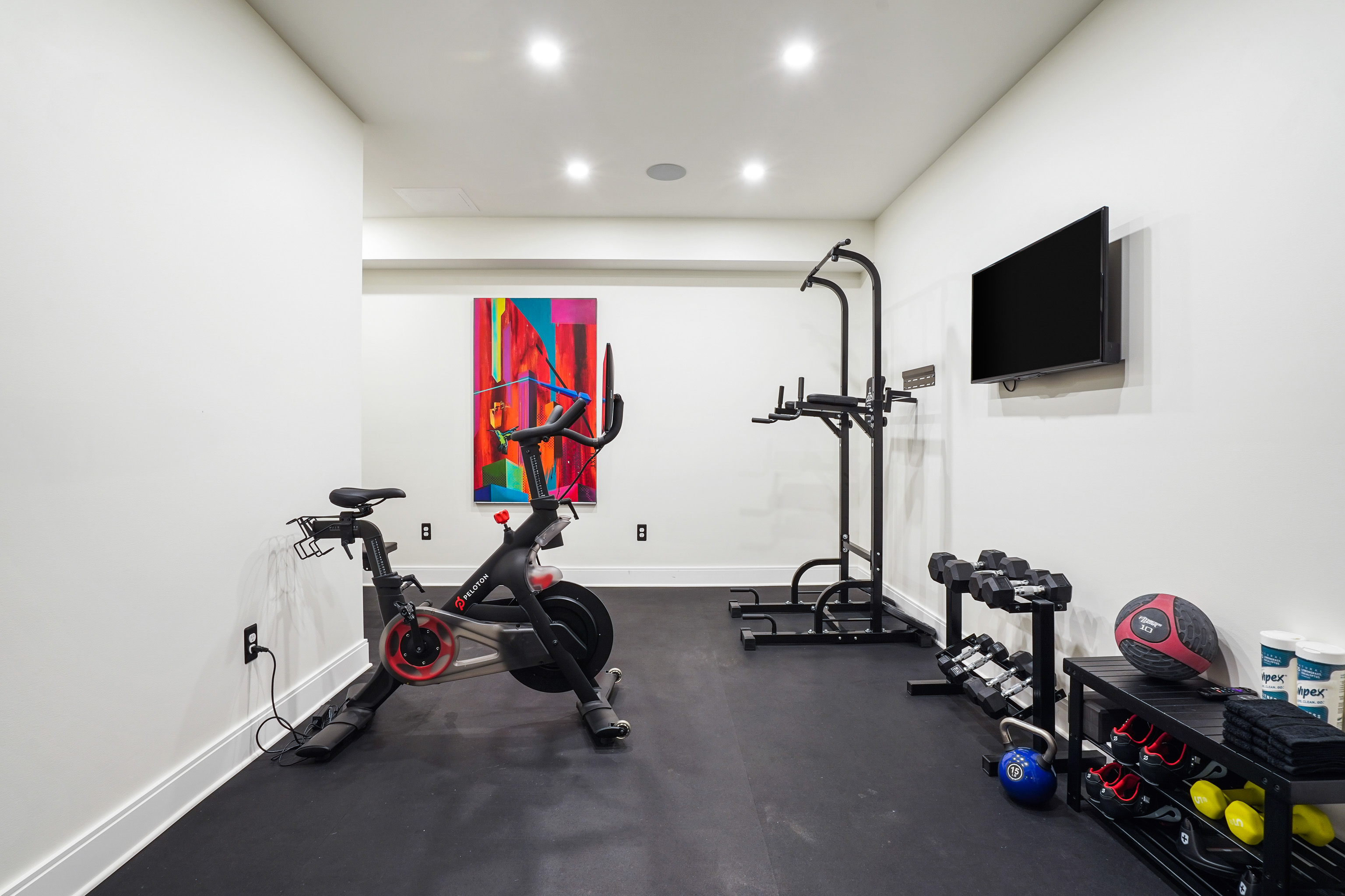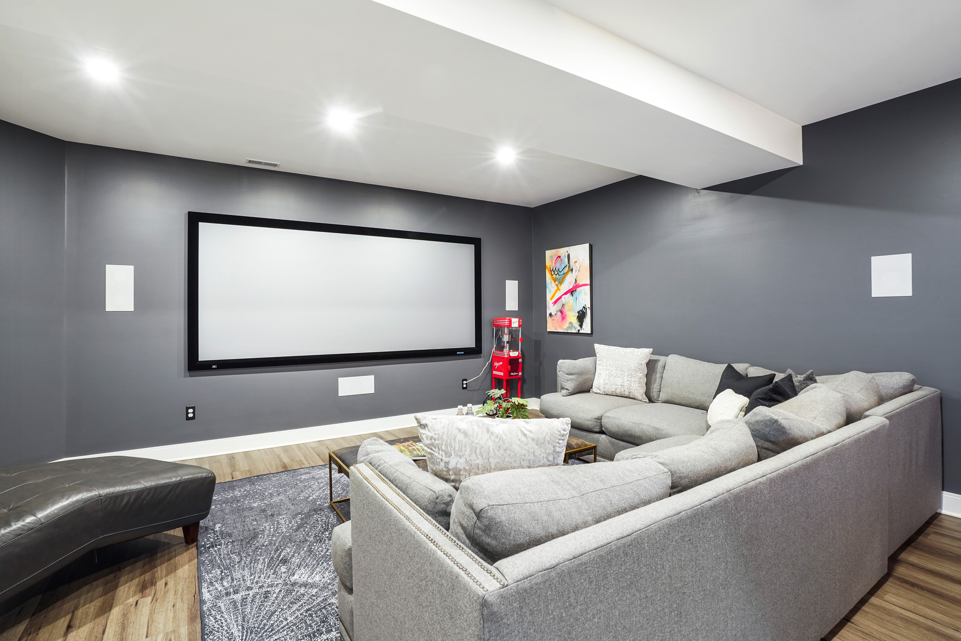The owner’s suite features a private balcony and a spacious bathroom with a dual shower and a soaking tub. Down to the basement, a theater and recreation room features a wet bar connecting to a home fitness room. A fourth bedroom with a bathroom rounds out the lower level.