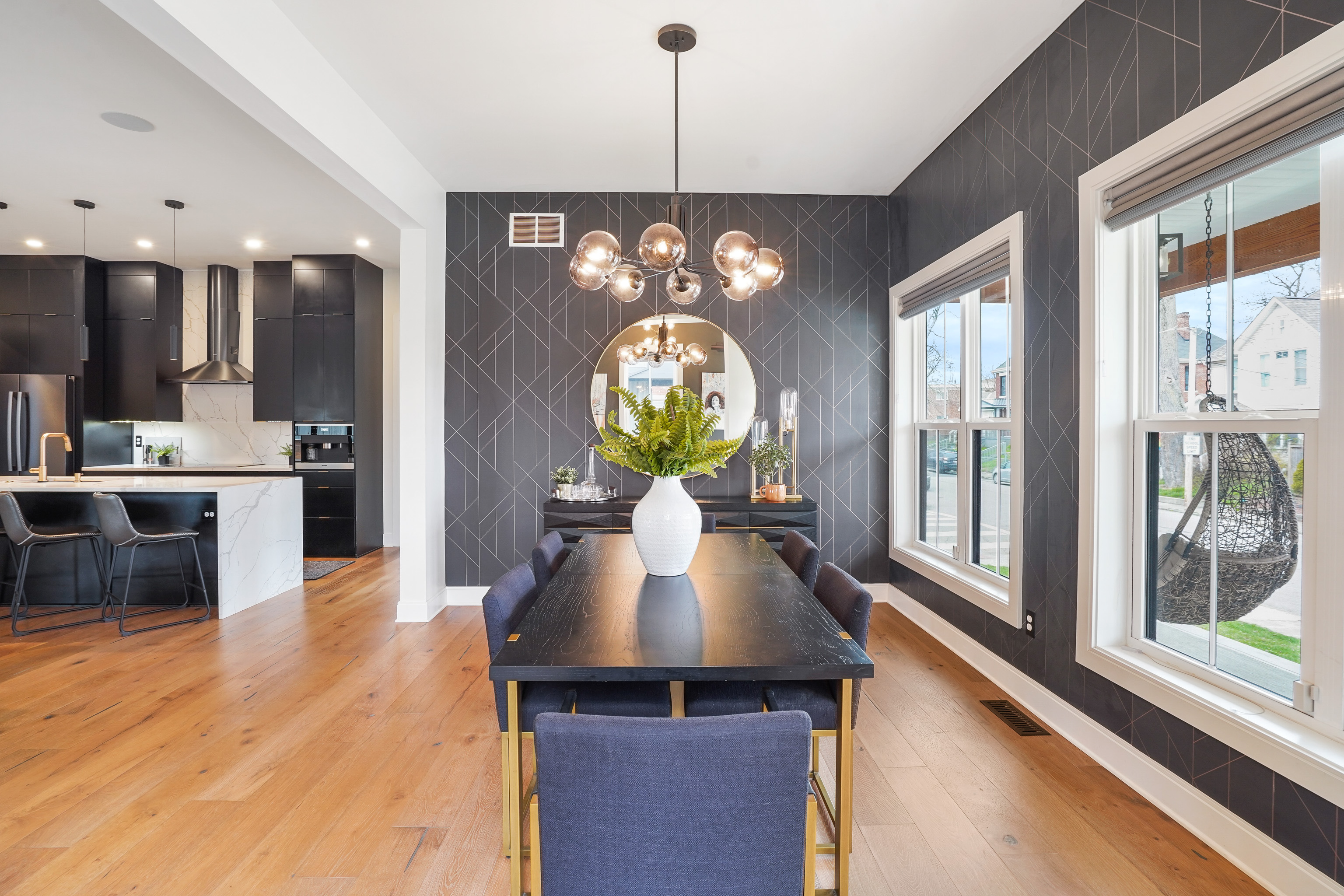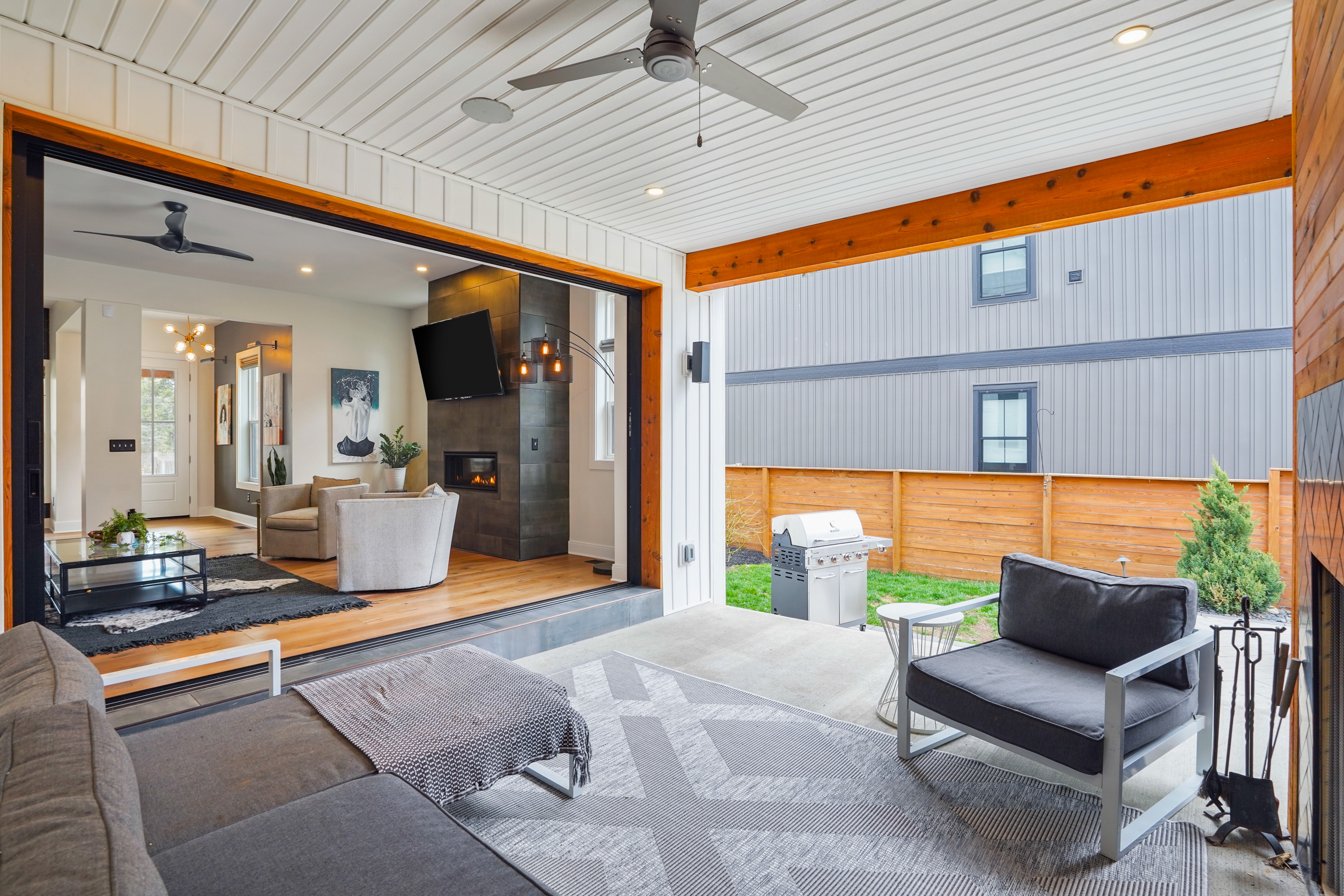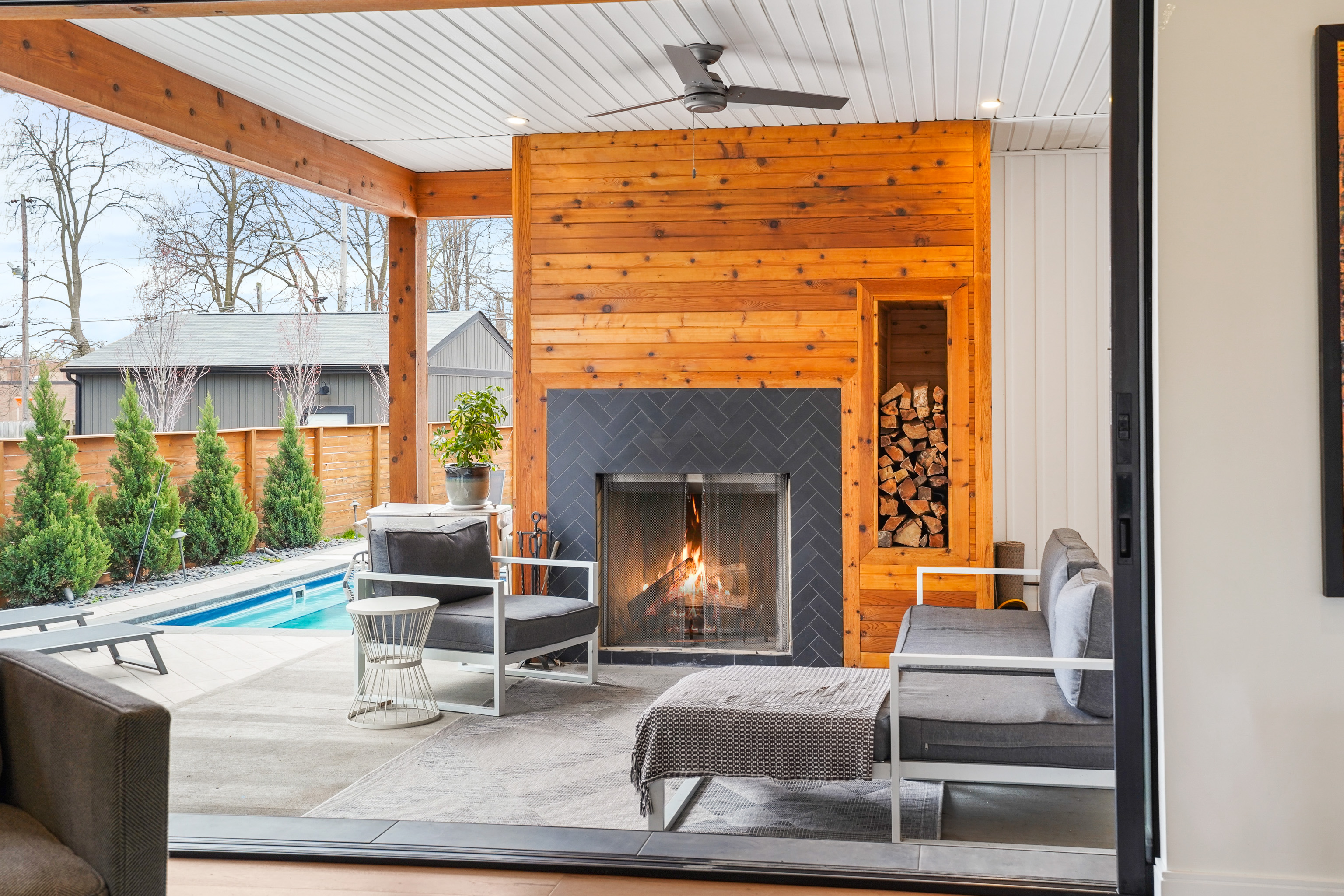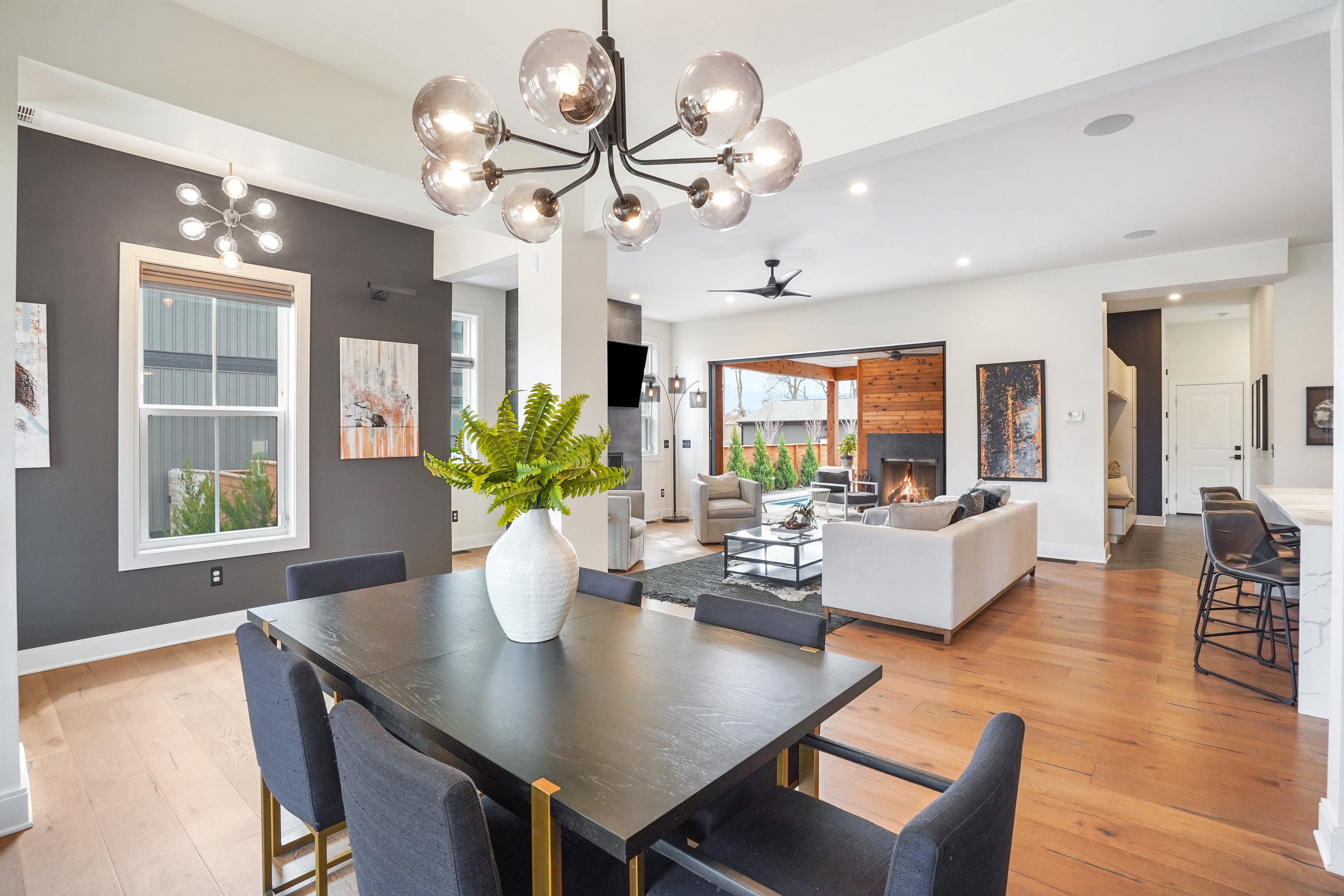 The first floor seamlessly flows from space to space with an open floor plan including the living room, dining room and kitchen. Wood flooring sprawls the first level with white walls and black and gray accents, leading to a covered patio with a wood-burning fireplace and an inground pool.