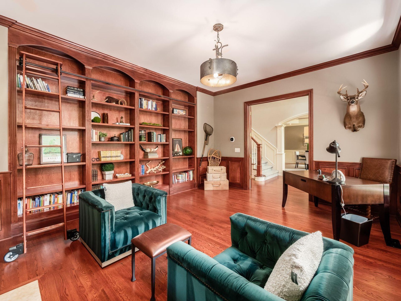 Off the entry way, a study sits with a library featuring built-in bookshelves and, across the hall, a formal dining room connecting to the kitchen with white cabinetry and center island. Off the kitchen and second dining table, another living room with a stone fireplace sits with glass doors leading to the expansive backyard porch.