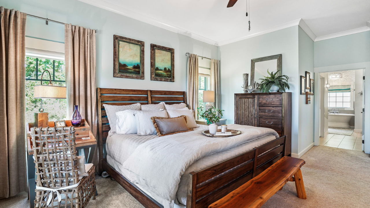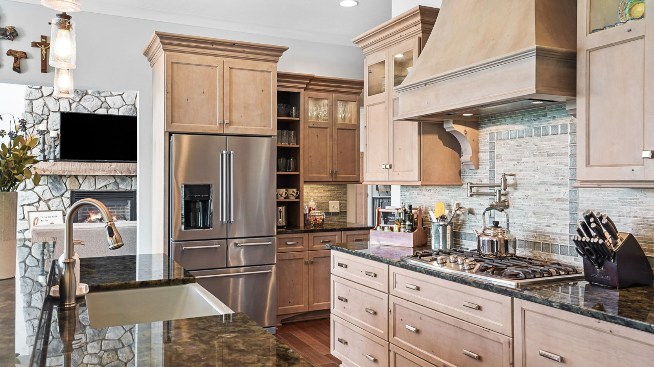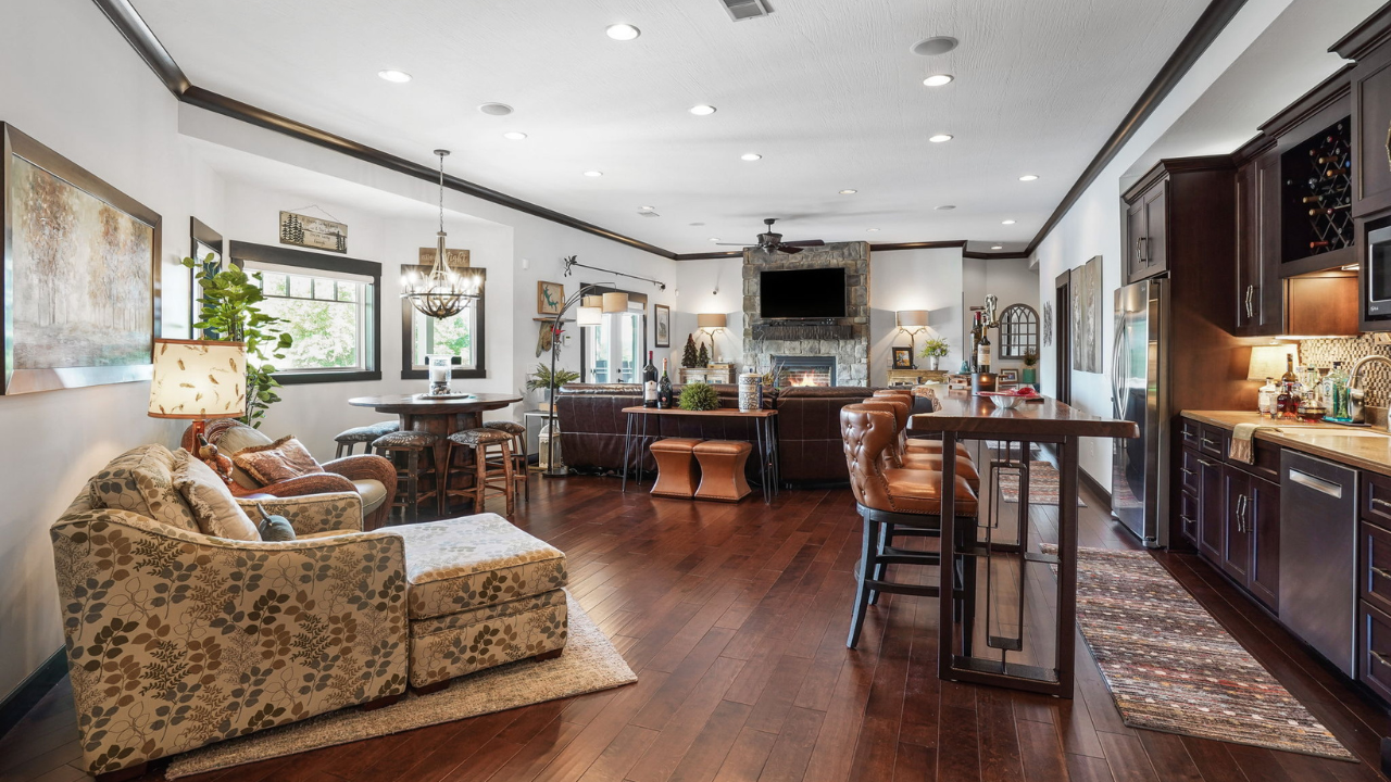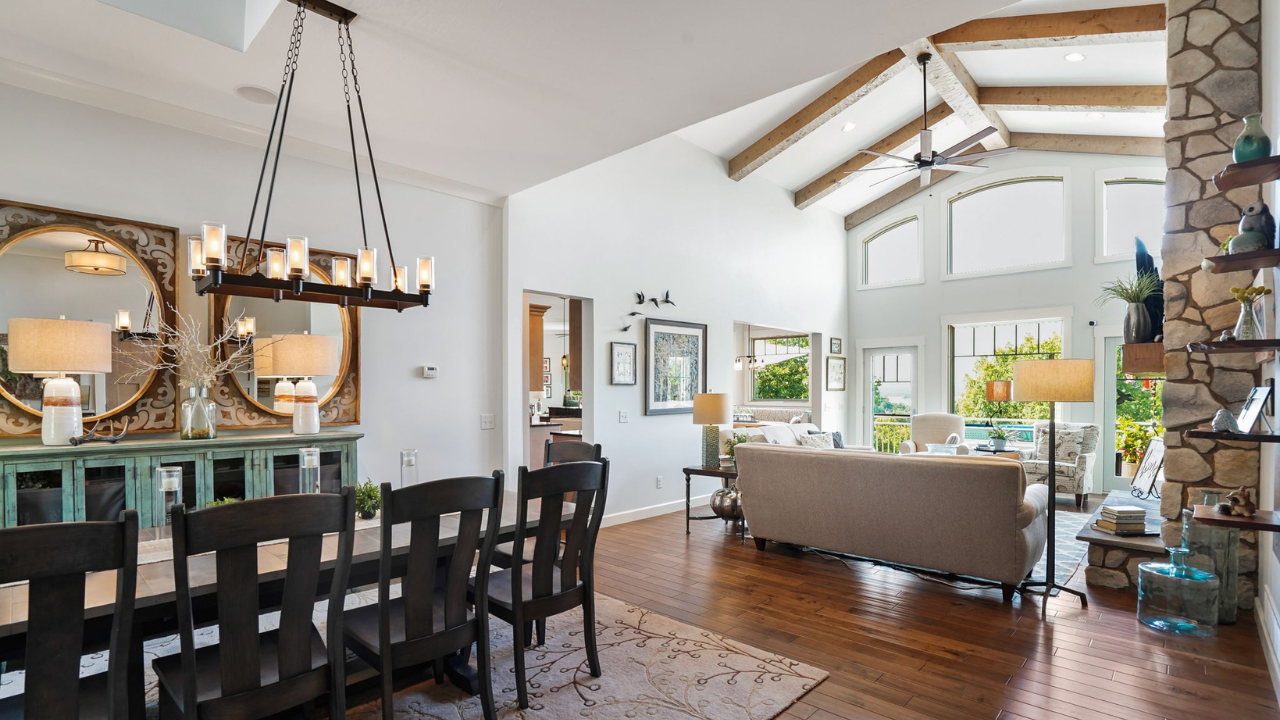 Inside, large windows line the two-story living room adorned with wood beams and providing sweeping views of the backyard outdoor living space. To left, the modern kitchen features an island with barstool seating, a spacious breakfast nook and a second cozy living room with a fireplace.