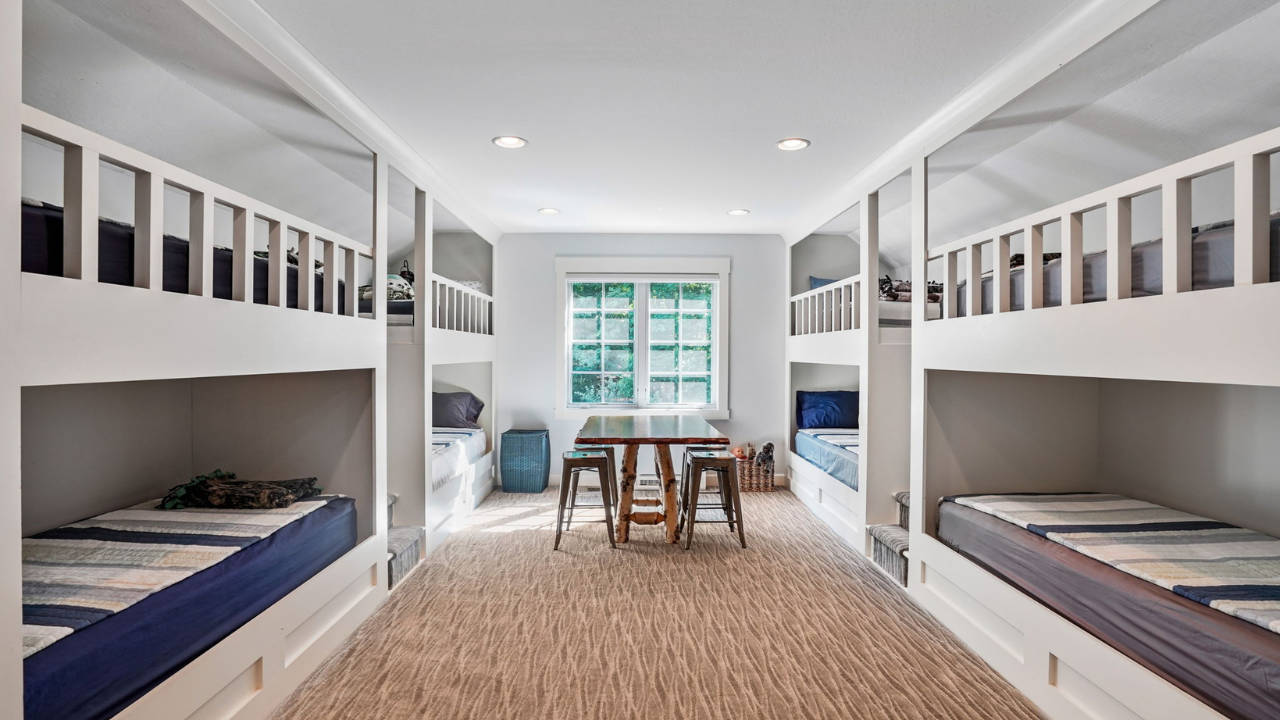 Up the stairs, a custom children’s room is home to eight built-in bunk beds. Below the main floor, a finished level includes a bar, kitchenette, a third living room and double doors leading out to the main pool deck. Four additional bedrooms and a second laundry room fill out the lower level.