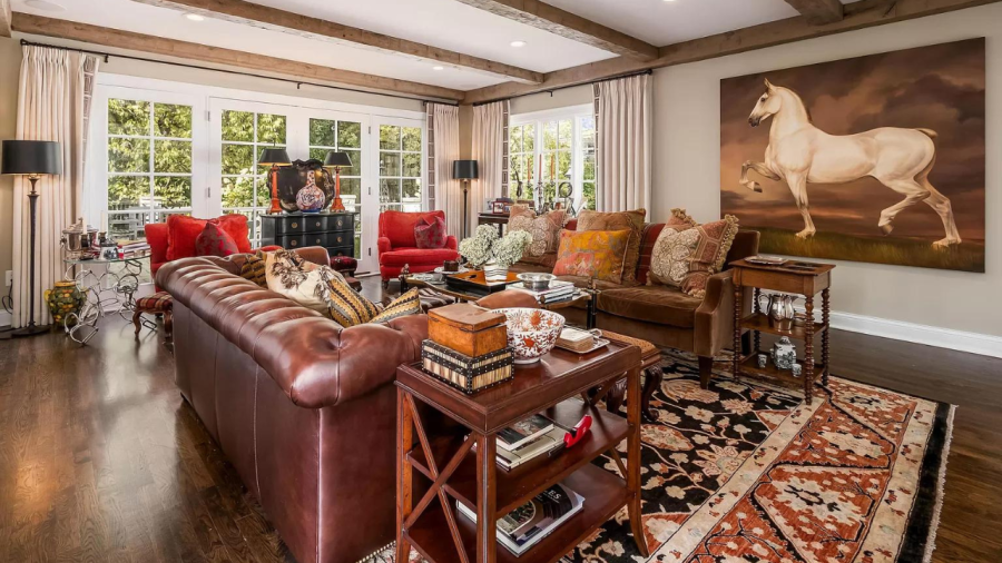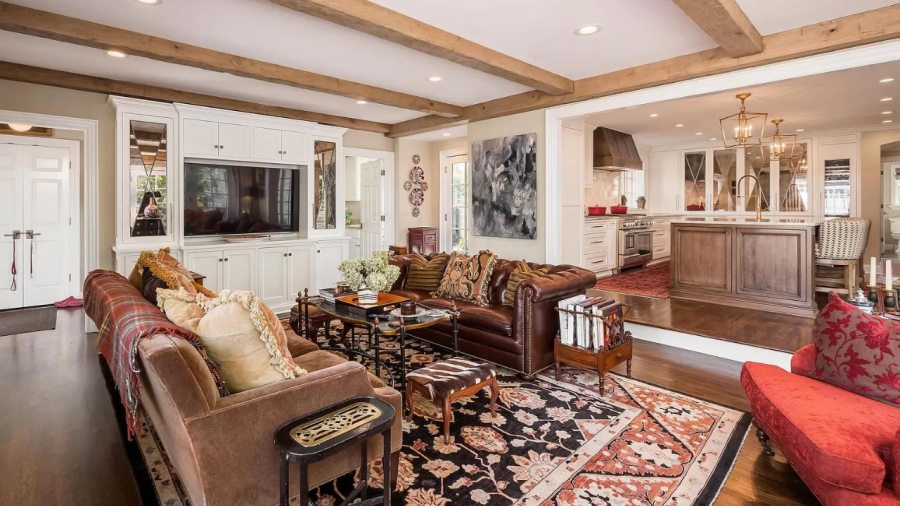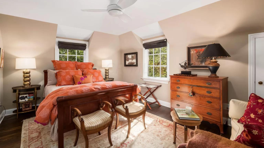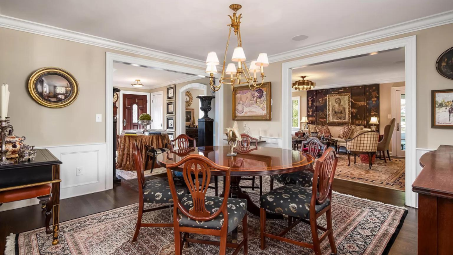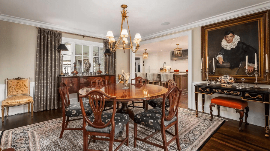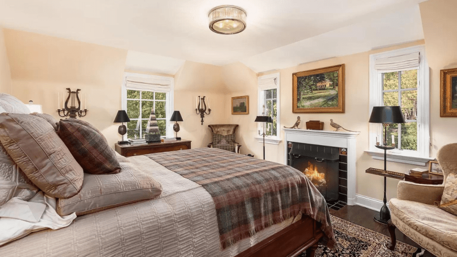 Toward the rear, the manor’s kitchen features white cabinets, a rustic range hood, brass finishes and an oversized island with barstools, then connecting to another living room with floor-to-ceiling windows. Up the stairs, the home’s classic aesthetic continues into the bedrooms with gold and silver light fixtures and antique wood furnishings.