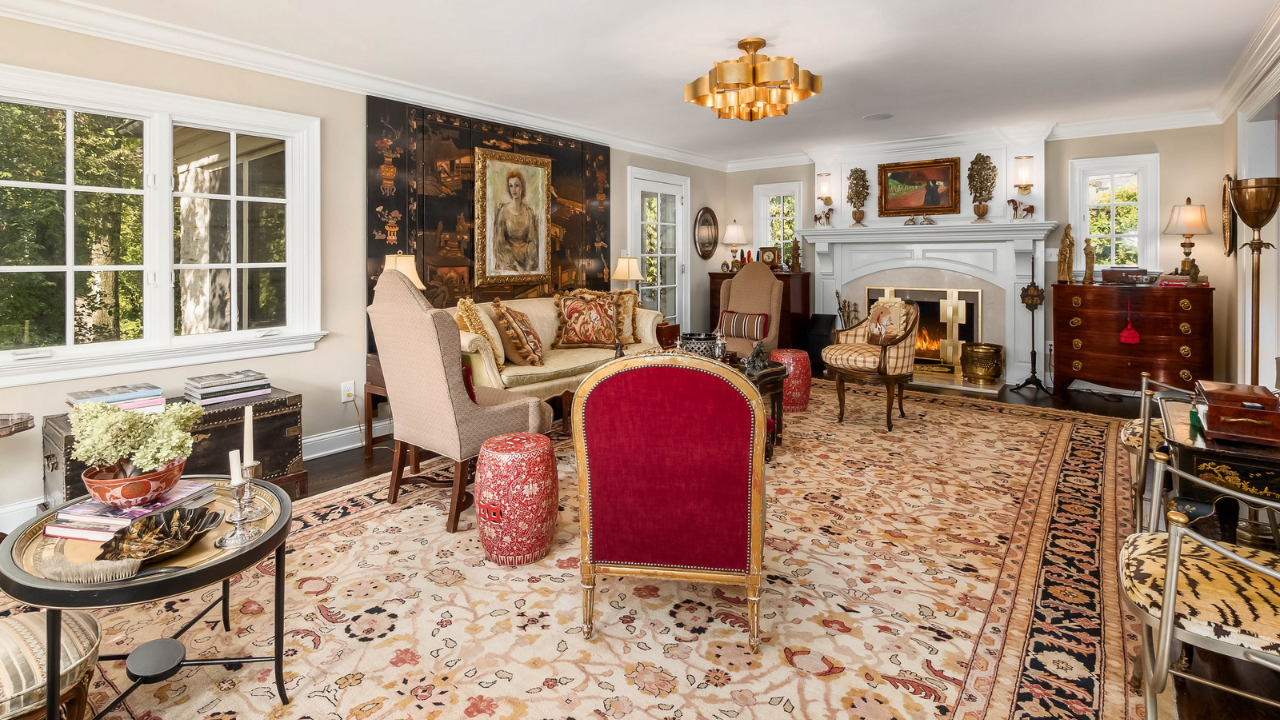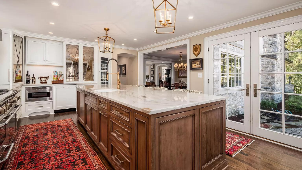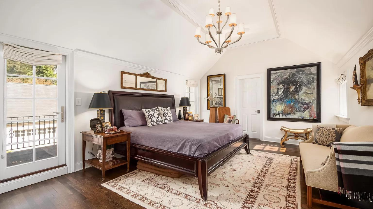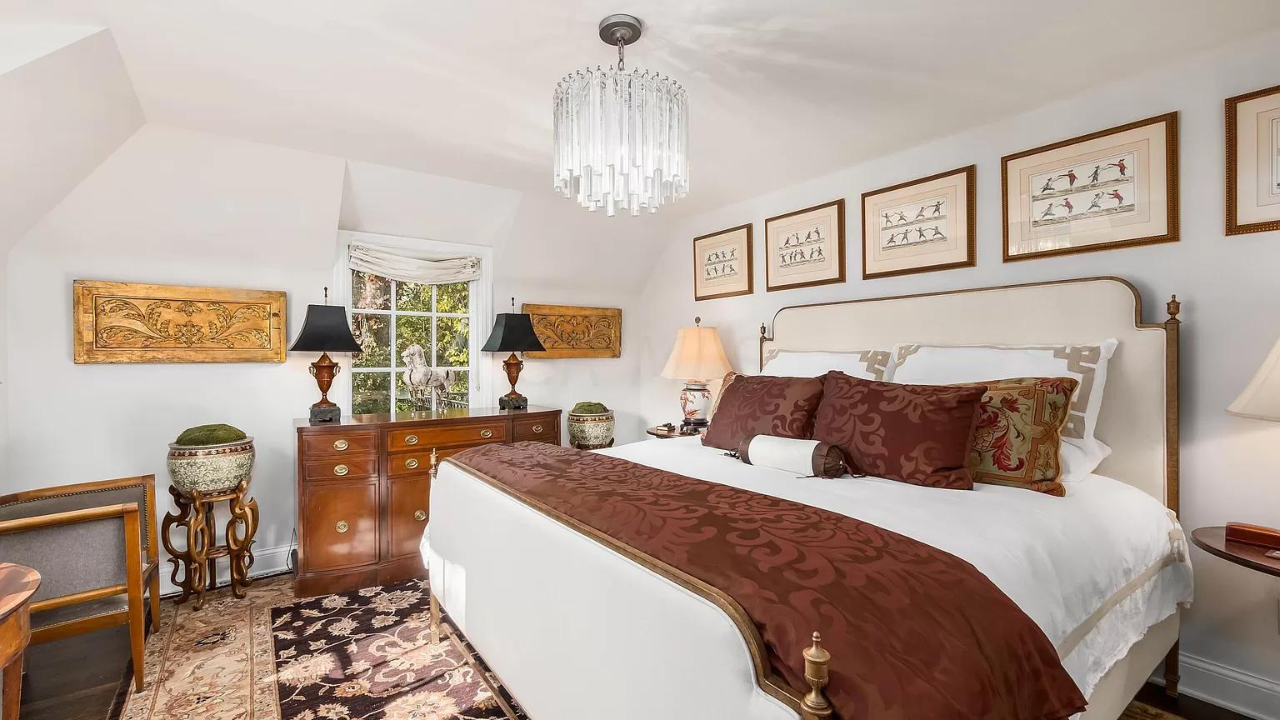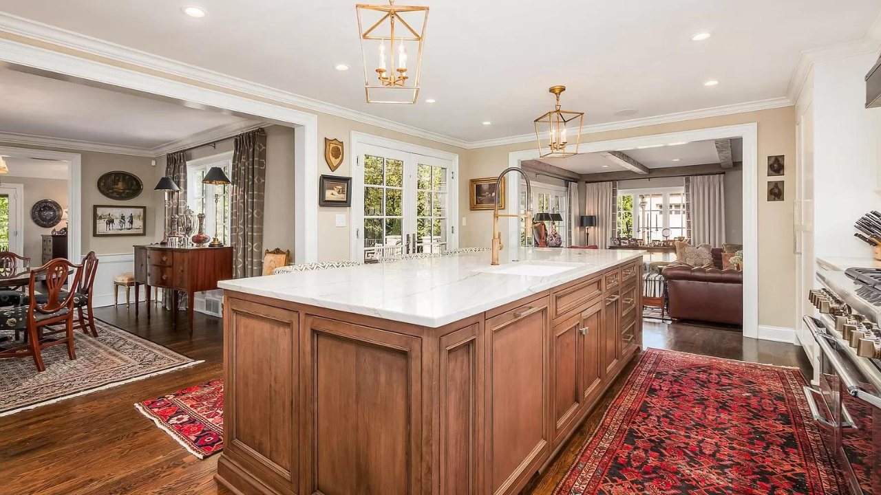 Toward the rear, the manor’s kitchen features white cabinets, a rustic range hood, brass finishes and an oversized island with barstools, then connecting to another living room with floor-to-ceiling windows. Up the stairs, the home’s classic aesthetic continues into the bedrooms with gold and silver light fixtures and antique wood furnishings.