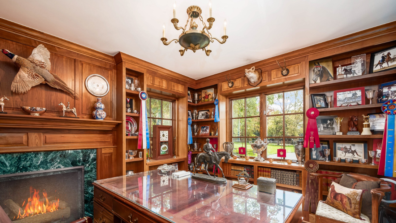 Inside, the entryway splits into several living spaces, including a formal sitting room to the left adorned with a wood-burning fireplace and gold accents. To the right, the home’s main office also features a fireplace with custom built-in bookcases home to equestrian trophies, ribbons and other accolades.