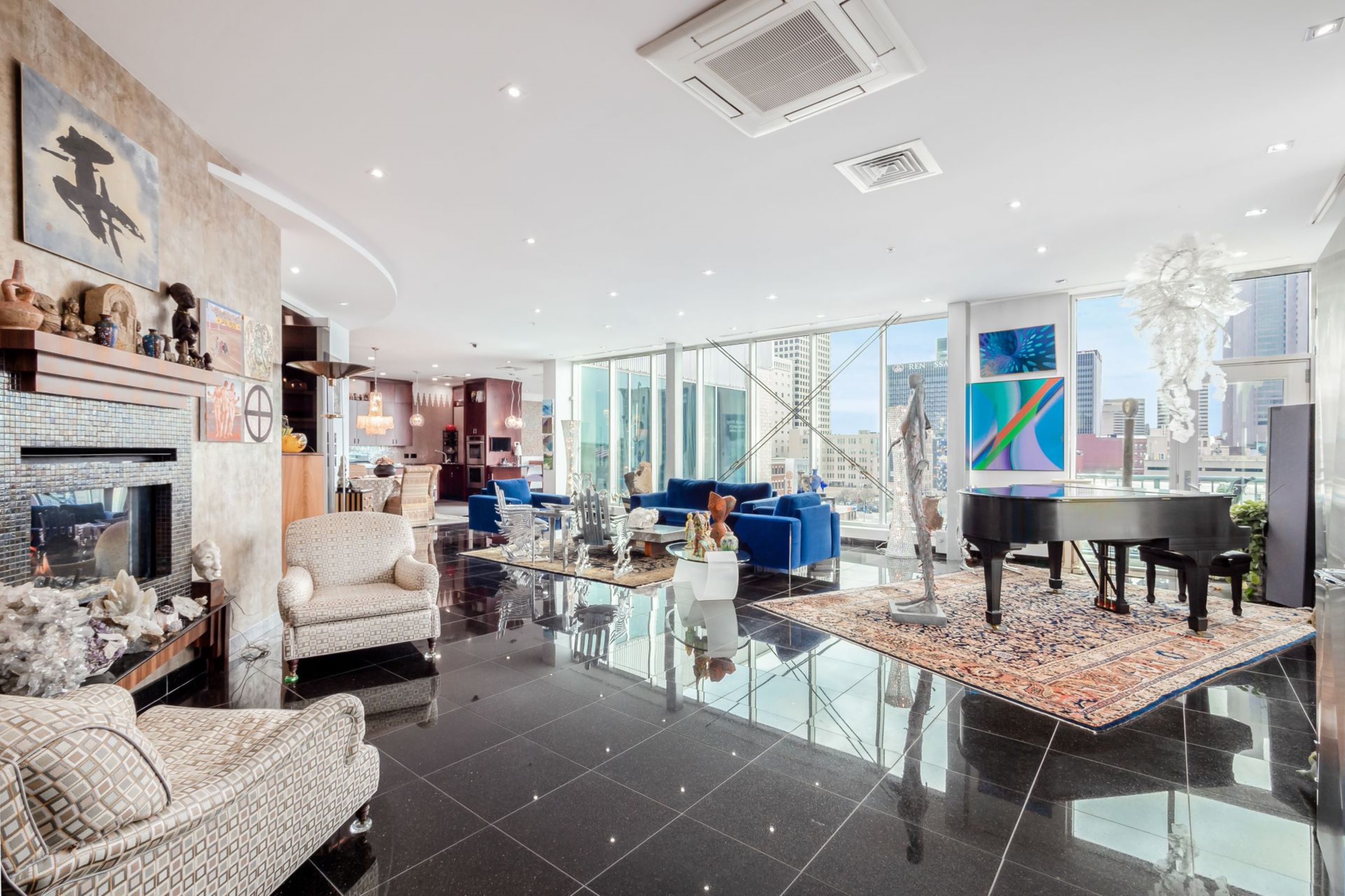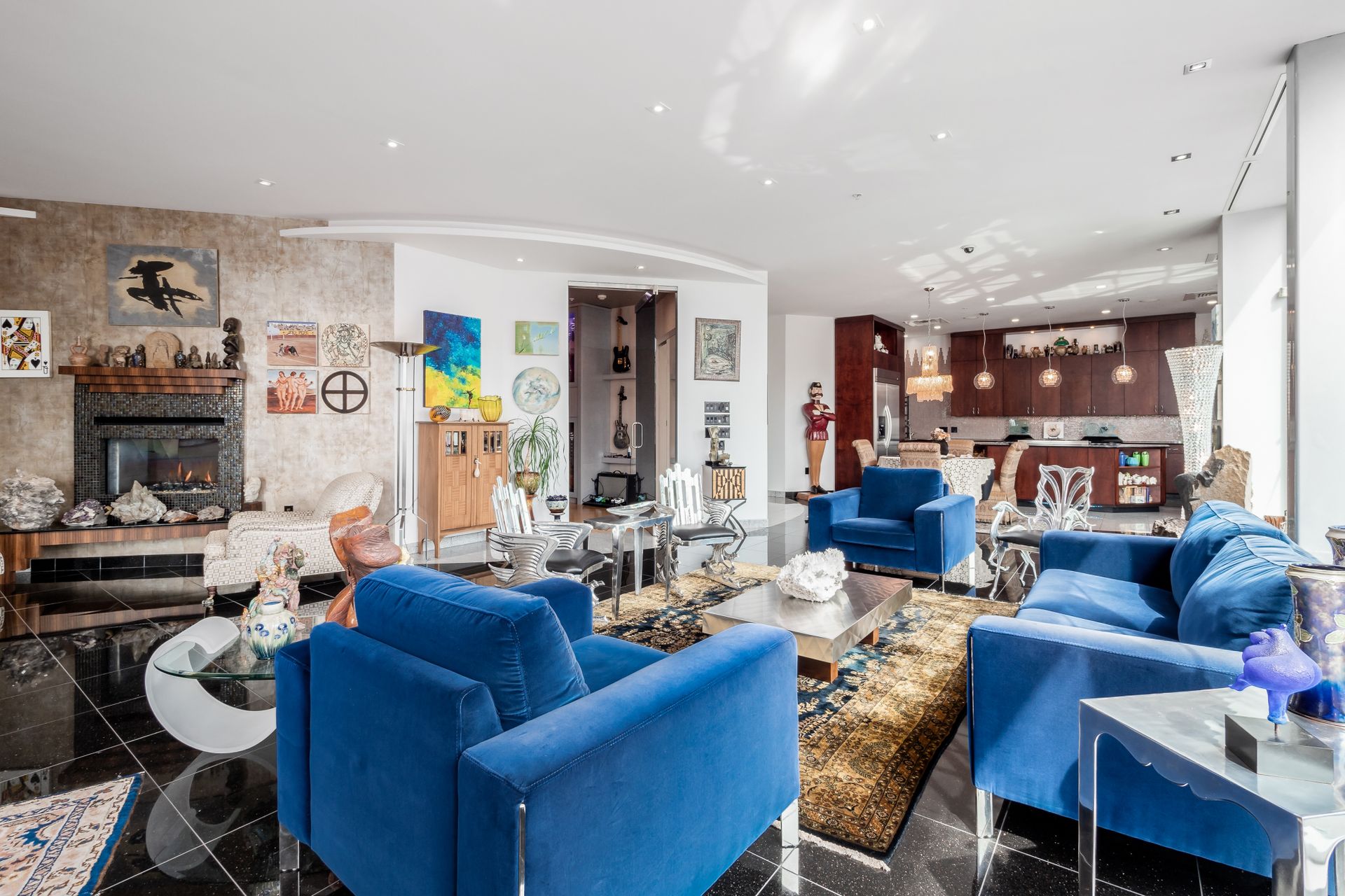 Black granite flooring with gold flakes sprawl the space with floor-to-ceiling windows offering an unobstructed view of the city. The living room features a fireplace with a mantle made of zebra wood and the kitchen is complete with custom cabinetry.