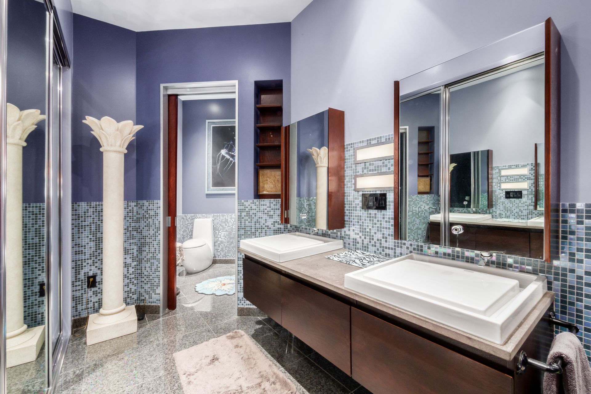 Rounding out the penthouse are several distinct spaces, including a large bedroom painted purple to seamlessly match the adjacent bathroom and walk-in closet. A glass fireplace and cabinets displaying the owner’s guitar collection decorate a casual sitting room.