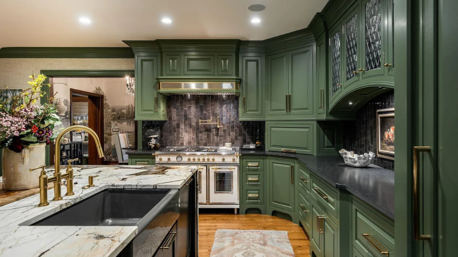 The kitchen comes to life with hardwood flooring and asparagus green cabinetry with pops of gold. The central island includes a sink, and quartz counterspace and the kitchen’s state-of-the-art stovetop are highlighted by dark backsplash. The deep tones of the kitchen are offset by a fireplace, dining nook and various light cream and gold details.