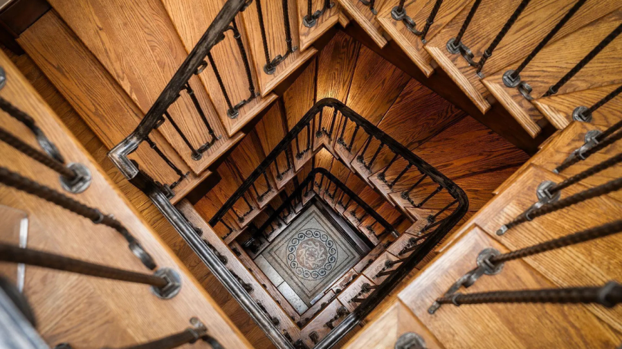 Up a spiraling staircase, residents can look out over the entertainment space below. The primary bedroom has another fireplace, walk-in closets and an ensuite bath with heated floors, a clawfoot tub, and double sink. The second story has four additional bedrooms, four full baths and a half bath, as well as a warm office space and impressive walk-in closets.