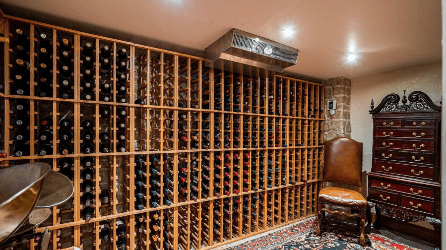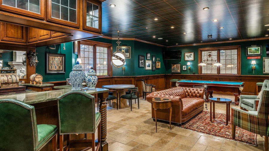 The lower level is especially suited to entertaining or a family night in. The massive space features a Ralph Lauren-inspired billiards room with a full bar. The lower level also has a family room with stone walls and a floor-to-ceiling wine cellar. Another office rounds off the lavish lower level.