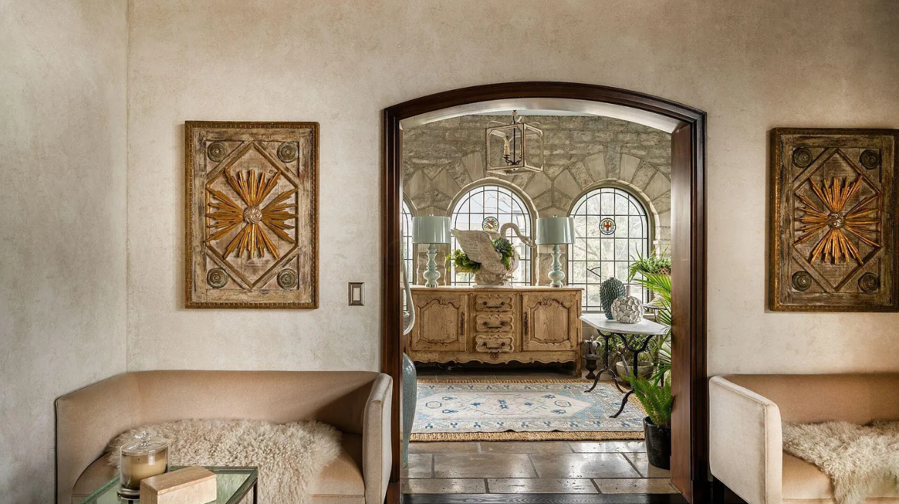 A roundabout driveway leads to the stone home’s front stoop, embellished by two statuettes. Inside, the first floor is warm and lavish, characterized by custom woodwork, coffered ceilings and window details that give the home an attention to detail rarely found in modern homes.