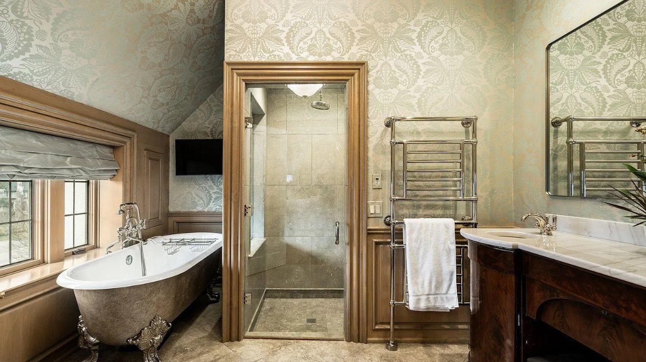 Up a spiraling staircase, residents can look out over the entertainment space below. The primary bedroom has another fireplace, walk-in closets and an ensuite bath with heated floors, a clawfoot tub, and double sink. The second story has four additional bedrooms, four full baths and a half bath, as well as a warm office space and impressive walk-in closets.