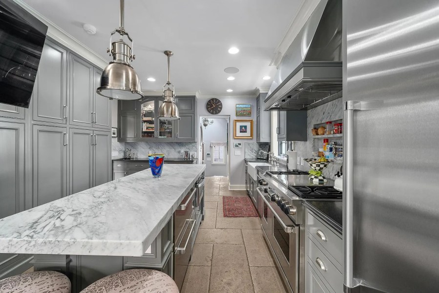 The kitchen offers state-of-the-art appliances centered by a marble kitchen island with built-in appliances for seamless cooking. The home also has a dining room, powder room, laundry and mud room, music room, living room and library. Built-in shelving colors the library for cozy reading, and both the library and dining room have fireplaces.