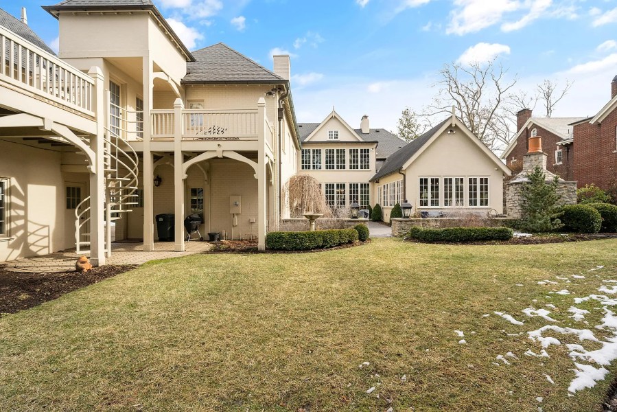 Outside, a stone patio and fireplace leaves plenty of space for outdoor entertaining. A spiral staircase connects a brick first-floor landing with spacious upstairs balconies. The fenced yard embraces privacy, echoed by the quiet neighborhood just a short walk from Wolfe Park.