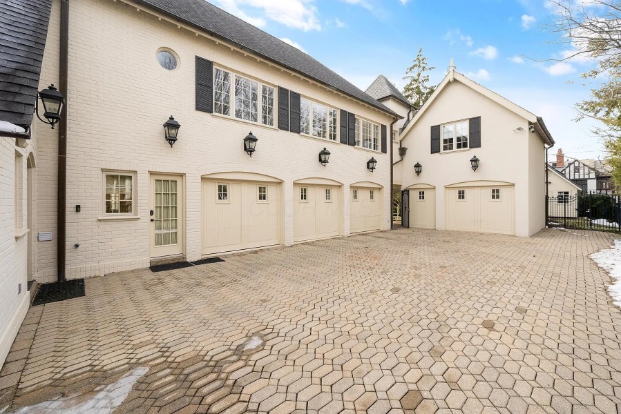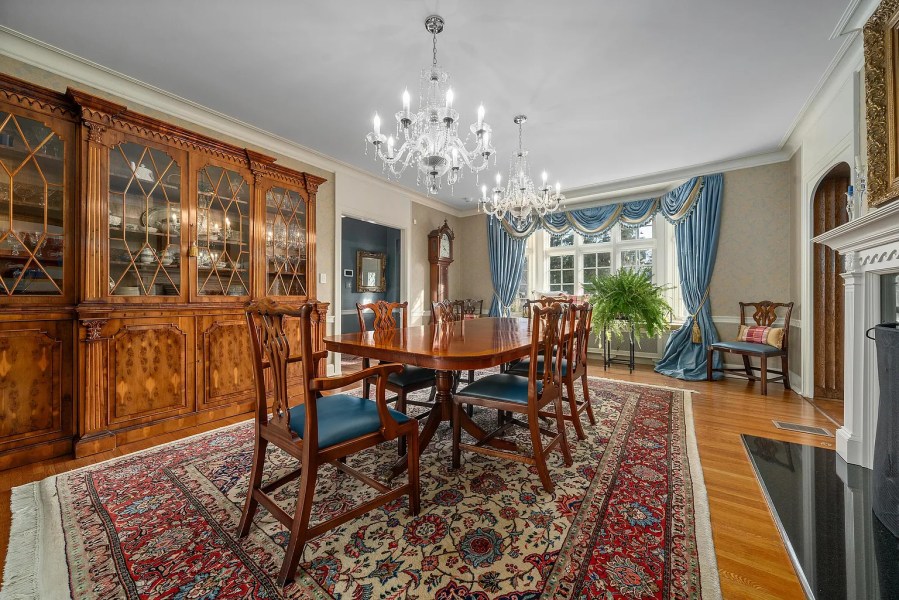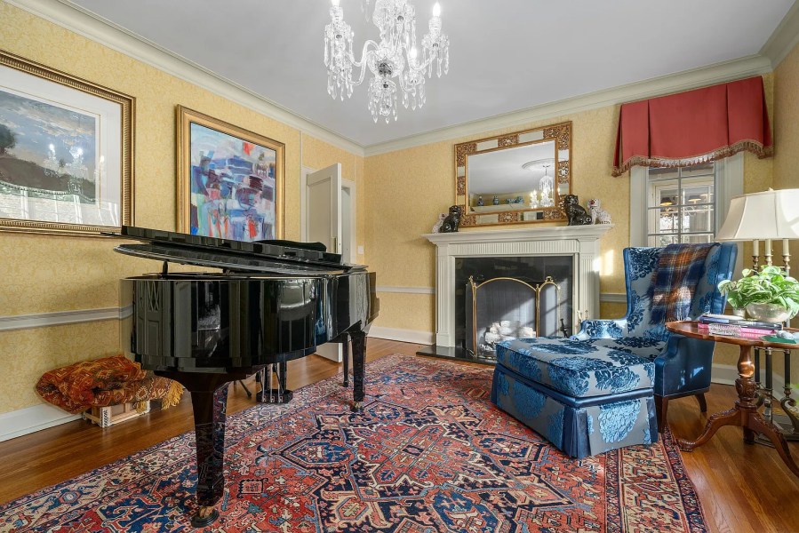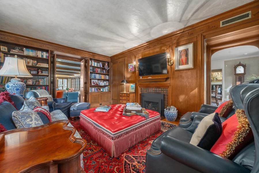 The kitchen offers state-of-the-art appliances centered by a marble kitchen island with built-in appliances for seamless cooking. The home also has a dining room, powder room, laundry and mud room, music room, living room and library. Built-in shelving colors the library for cozy reading, and both the library and dining room have fireplaces.
