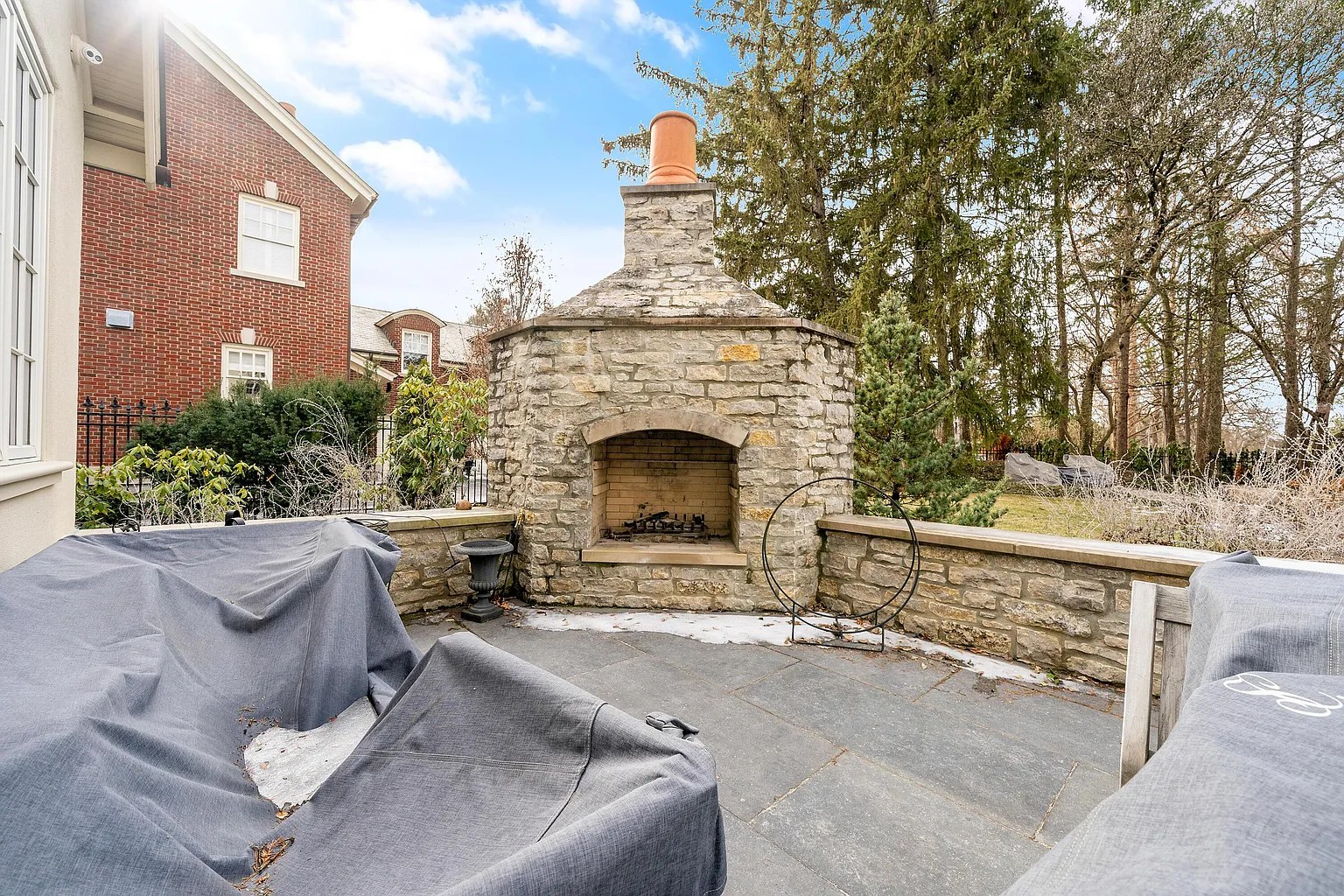 Outside, a stone patio and fireplace leaves plenty of space for outdoor entertaining. A spiral staircase connects a brick first-floor landing with spacious upstairs balconies. The fenced yard embraces privacy, echoed by the quiet neighborhood just a short walk from Wolfe Park.